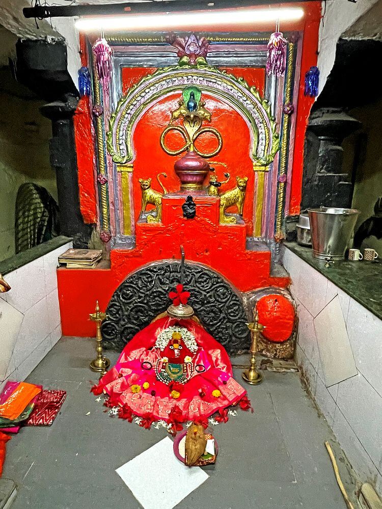 अंतराळाचे प्रवेशद्वार दगडी व त्रिशाखीय आहे. त्याचे द्वारस्तंभ कोरीवकाम केलेले आहेत. वरच्या बाजूस शिखरासारखा आकार व ललाटबिंबस्थानी गणेशाची कोरीव मूर्ती आहे. गर्भगृहात उंच वज्रपीठावर देवीची तांदळा स्वरूपातील वस्त्रालंकारांनी सुशोभित मूर्ती विराजमान आहे. त्यावर डोळे, ओठ व नाक कोरलेले आहे. वरच्या बाजूस चांदीचे छोटे छत्र आहे. या मूर्तीच्या मागे बाजूने पायऱ्यांचा आकार असलेली पाठशिला आहे. त्यावर मध्यभागी काळा रंग दिलेला व नक्षीकाम केलेला अर्धचंद्राकार आहे. वरच्या बाजूस कलशाकार कोरलेला आहे व त्याच्या दोन्ही बाजूंस व्याघ्रशिल्पे आहेत.