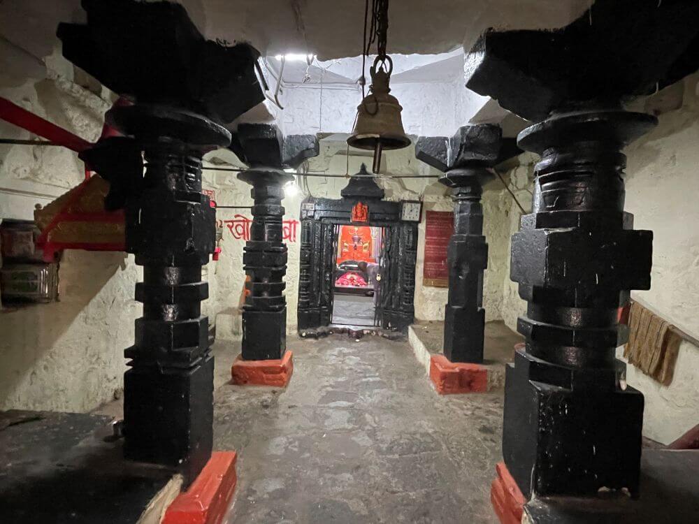 अंतराळाचे प्रवेशद्वार दगडी व त्रिशाखीय आहे. त्याचे द्वारस्तंभ कोरीवकाम केलेले आहेत. वरच्या बाजूस शिखरासारखा आकार व ललाटबिंबस्थानी गणेशाची कोरीव मूर्ती आहे. गर्भगृहात उंच वज्रपीठावर देवीची तांदळा स्वरूपातील वस्त्रालंकारांनी सुशोभित मूर्ती विराजमान आहे. त्यावर डोळे, ओठ व नाक कोरलेले आहे. वरच्या बाजूस चांदीचे छोटे छत्र आहे. या मूर्तीच्या मागे बाजूने पायऱ्यांचा आकार असलेली पाठशिला आहे. त्यावर मध्यभागी काळा रंग दिलेला व नक्षीकाम केलेला अर्धचंद्राकार आहे. वरच्या बाजूस कलशाकार कोरलेला आहे व त्याच्या दोन्ही बाजूंस व्याघ्रशिल्पे आहेत.
