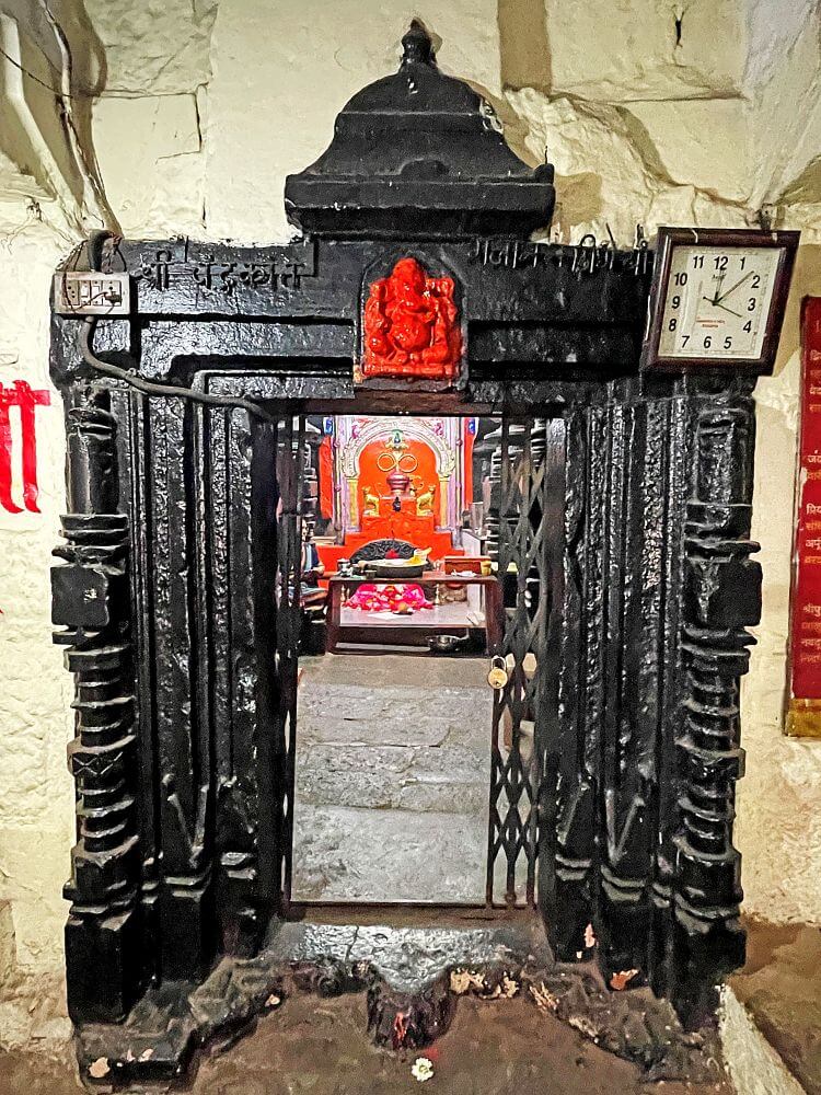 त्याच्या वरच्या बाजूला तीन देवतांच्या कोरीव मूर्ती आहेत. त्यांवर दिलेला रंग आणि कालौघात झालेली झीज यांमुळे या मूर्ती अस्पष्ट आहेत. येथेच चौकटीच्या वरील दोन्ही बाजूंस अश्वमुखे पाहावयास मिळतात.