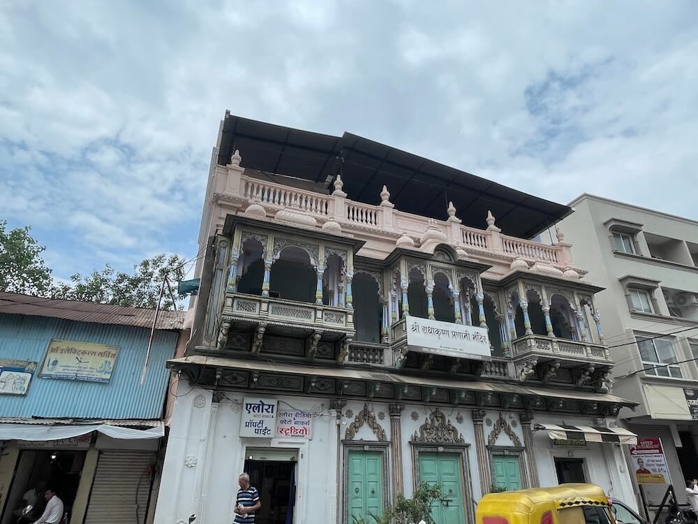 Padmavatipuri Dham are also considered principal pilgrimage centers of the sect. Scattered across the country, many other Pranami temples exist, one of the oldest of which stands in Indore, said to have been established in 1920.The temple is located on a bustling thoroughfare at Gorakund Square. Its two-storied structure resembles an old princely mansion. On the upper floor are three large wooden galleries, with beautifully carved wooden pillars and arches. The roof carries an ornate wooden railing. On the ground floor, the temple has three entryways leading into a spacious sabhamandap. Within this hall, adorned with numerous circular pillars, are displayed portraits of revered saints of the Pranami sect. One wall holds a painting in the style of Raja Ravi Varma, depicting Krishna with the Gopis. The ceiling of the hall is decorated with fine ornamental work. Towards the front, lies the sanctum of the temple.