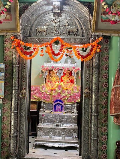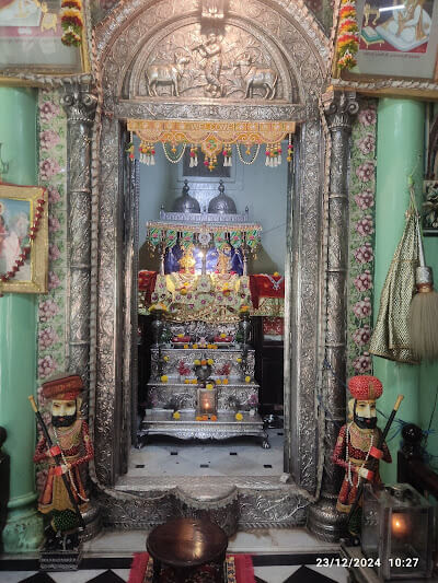 The sanctum stands between two pillars with a tall entrance, clad in golden sheets with intricate carvings. On either side of its doorframes are guardian figures. Above the lintel is carved the image of Lord Krishna playing his flute. Inside, placed atop a silver-plated pedestal, rest the sacred scriptures of the sect, i.e. the ‘Taratamvani’ and the ‘Shrimad Bhagavad Gita’, revered as the embodiment of Radha and Krishna. These texts are adorned with fine cloth and flower garlands, representing the divine couple. An eternal flame is kept burning here.