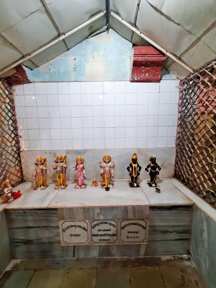 मंदिराच्या प्रवेशद्वारावर जय–विजय यांच्या प्रतिमा आहेत. ललाटबिंबावर गणेशमूर्ती व मंडारकावरील अर्धचंद्रशिलेवर कीर्तिमुख आहे. येथून आत आल्यावर समोर रामदरबार दिसतो. त्यामध्ये श्रीराम, सीता, लक्ष्मण, विष्णू, विठ्ठल–रखुमाई व मारुती यांच्या मूर्ती आहेत. या दरबाराच्या बाहेर डावीकडील देवळ्यांत एकमुखी दत्त व गणेशमूर्ती आहेत. उजव्या बाजूला असलेल्या स्वतंत्र गर्भगृहात दुर्गामातेची वैशिष्ट्यपूर्ण चतुर्भुज रेखीव मूर्ती आहे. दुर्गामातेच्या गर्भगृहाला स्वतंत्र कळस आहे. त्याच्या पाषाणी घुमटाची रचना आतून शंकूच्या आकाराची आखीव व रेखीव आहे. रामेश्वर महादेवाच्या गर्भगृहासमोर अखंड पाषाणातील नंदी आहे. गर्भगृहाच्या दर्शनी भिंतीवर कालभैरवाची मूर्ती, शिवपिंडी व लहानसा नंदी आहे. प्रवेशद्वाराच्या ललाटबिंबावर गणेशमूर्ती व मंडारकावरील अर्धचंद्रशिलेवर कीर्तिमुख आहे. येथून पाच पायऱ्या उतरून गर्भगृहात जावे लागते. गर्भगृहाच्या मध्यभागी रामेश्वर महादेवाची मोठी व सुंदर पिंडी आहे. ही पिंडी भूतलापासून काहीशी उंच आहे. दुर्गामातेच्या गर्भगृहाप्रमाणे या गर्भगृहावरही स्वतंत्र दगडी कळस आहे. येथील दगडी घुमट हा त्या काळातील कुशल स्थापत्यशास्त्राचा उत्तम नमुना समजला जातो.