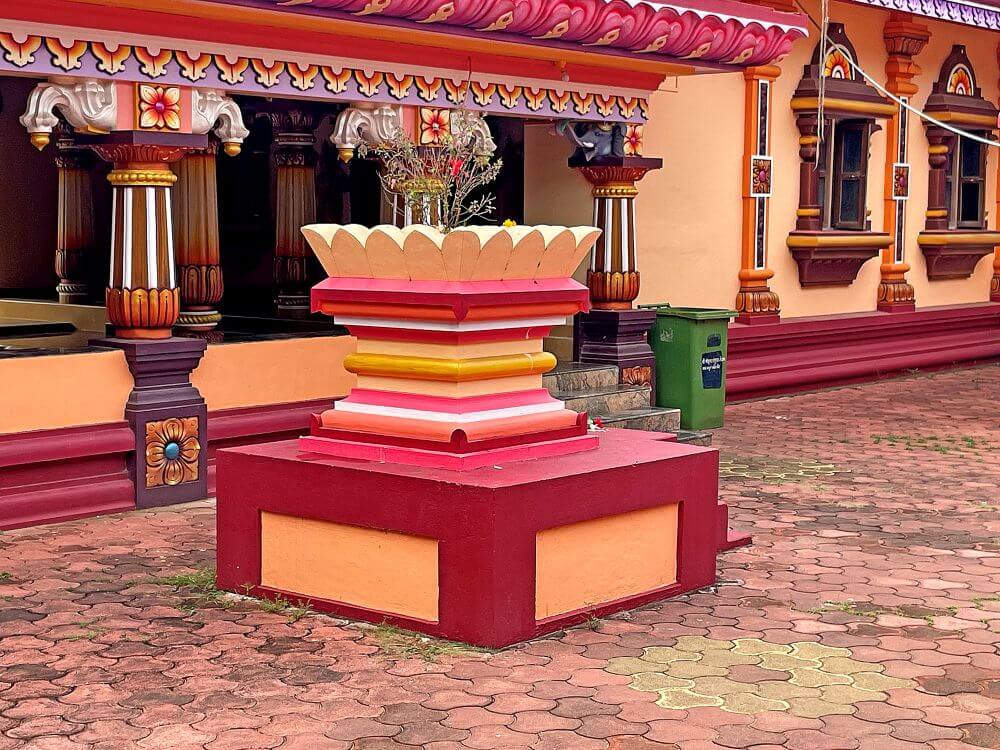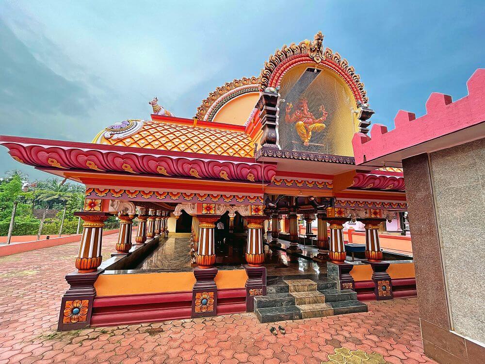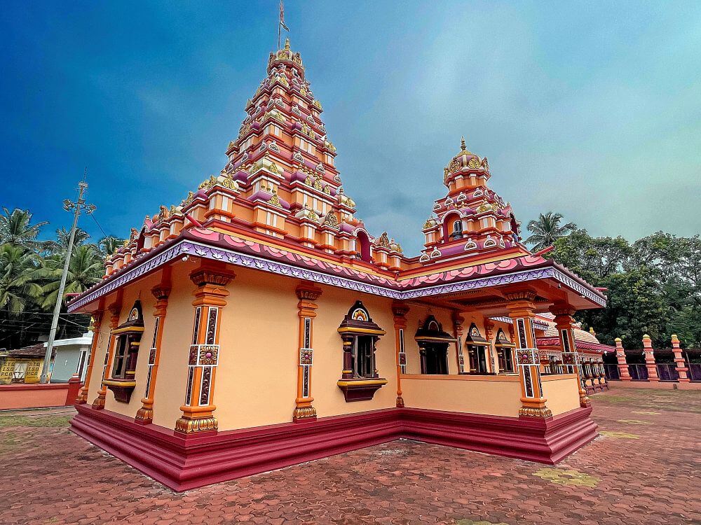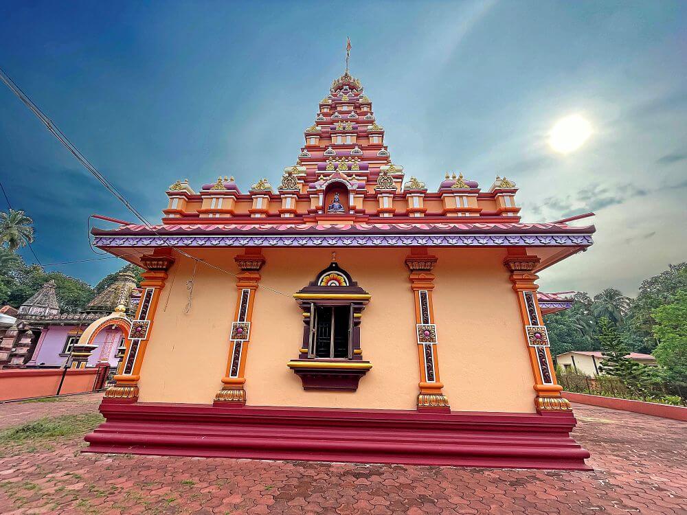 सभामंडपात नक्षीदार स्तंभांच्या चार रांगा आहेत. मधल्या दोन रांगांत प्रत्येकी पाच स्तंभ आहेत, तर बाजूच्या दोन रांगा प्रत्येकी सात स्तंभांच्या आहेत. कोकणी स्थापत्य शैलीनुसार सभामंडपाच्या मध्यभागी असलेली जमीन काही इंच खोलगट आहे. अर्धखुल्या स्वरूपाच्या या सभामंडपास बाजूने कक्षासने आहेत. येथील स्तंभांवर शीर्षस्थानी महादेव, विष्णू, मारुती, नंदी, कीर्तिमुख आदी शिल्पे कोरलेली आहेत व खांबावर खालच्या बाजूस कमळ फुलांची नक्षी आहे. येथील सर्व स्तंभ हे एकमेकांना नक्षीदार महिरपी कमानींनी जोडलेले आहेत. सभामंडपातील छत हे गजपृष्ठाकार आहे. येथील प्रवेशद्वाराकडील भिंतीवर तांडव नृत्य करणाऱ्या शिवाचे मोठे उठावशिल्प आहे. अंतराळाकडील भिंतीवर छताच्या लगत कैलास पर्वतावर बसलेले शिव-पार्वती, गणपती, नारद, कार्तिकेय, राजबक्ष, नंदी व सिंह यांची सुंदर उठावशिल्पे आहेत.