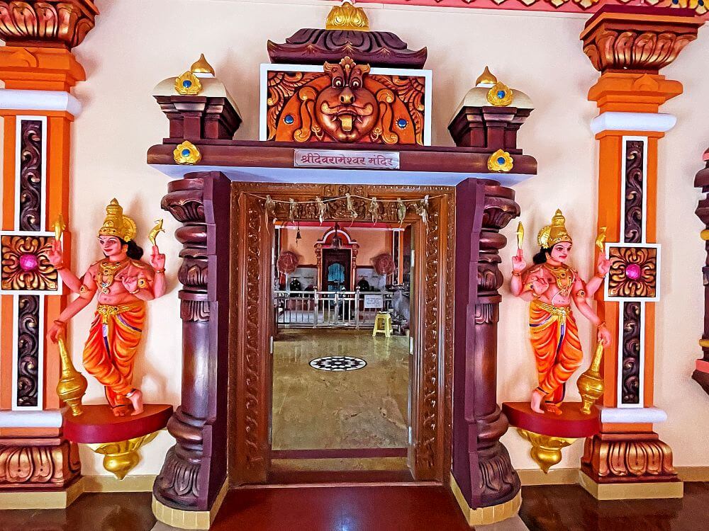 तेथून त्यापुढे असलेल्या दोन नक्षीदार स्तंभांतील द्वारातून अंतराळात प्रवेश होतो. या स्तंभांच्या दोन्ही बाजूस शंख, चक्र, गदा व पाश धारण केलेल्या चतुर्भुज द्वारपाल मूर्ती आहेत. अंतराळाच्या द्वारचौकटीवर ललाटबिंबस्थानी शेषशायी विष्णूचे उठावशिल्प कोरलेले आहे. या शिल्पामध्ये शेषावर पहुडलेला विष्णू, त्याच्या नाभीतून उगवलेल्या कमळातील ब्रह्मदेव आणि पायाशी लक्ष्मी आहे. यातील लक्ष्मीची वेशभूषा व केशरचना ही मराठी पद्धतीची आहे, हे विशेष. या चौकटीच्या वरच्या बाजूस गजानन आणि रिद्धी-सिद्धी यांच्या कोरीव मूर्ती आहेत. त्याच्याही वरच्या भागात भिंतीवर मोठे कीर्तिमुख आहे.