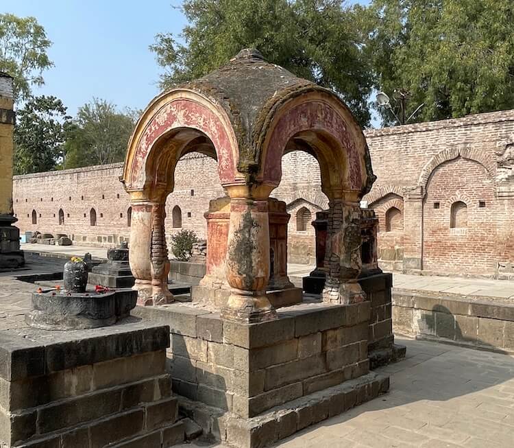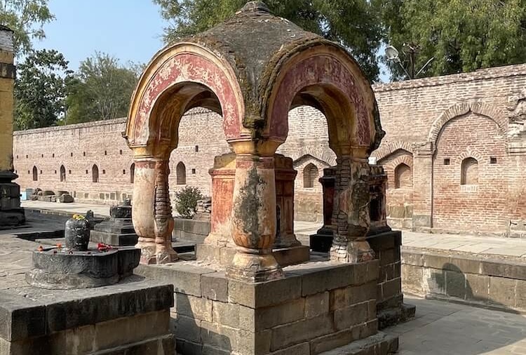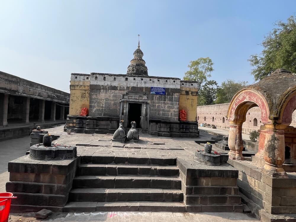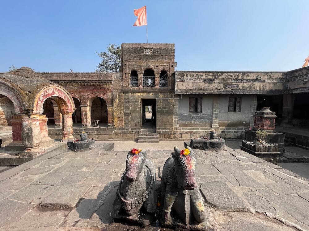 शिखराच्या शीर्षभागी आमलक व कळस आहे. मंदिराच्या मागील बाजूस, गर्भगृहाच्या मागे असलेल्या गोमुखातून शिवलिंगावर होणाऱ्या अभिषेकाचे जल बाहेर पडते. प्रांगणात जुनी विहीर आणि काही समाध्या आहेत. तटबंदीला लागून असलेल्या ओवऱ्यांच्या भिंतींवर जिजाऊ-शिवराय, देव-देवता तसेच संतांची चित्रे रंगवण्यात आली आहेत. एका ओवरीमध्ये अलीकडेच बांधलेल्या मंदिरात श्रीराम, लक्ष्मण, सीता व हनुमंताच्या मूर्ती आहेत. या मूर्तींसमोर पादुका ठेवलेल्या आहेत. परिसरात मंदिराचे काही अवशेषही विखुरलेले दिसतात.