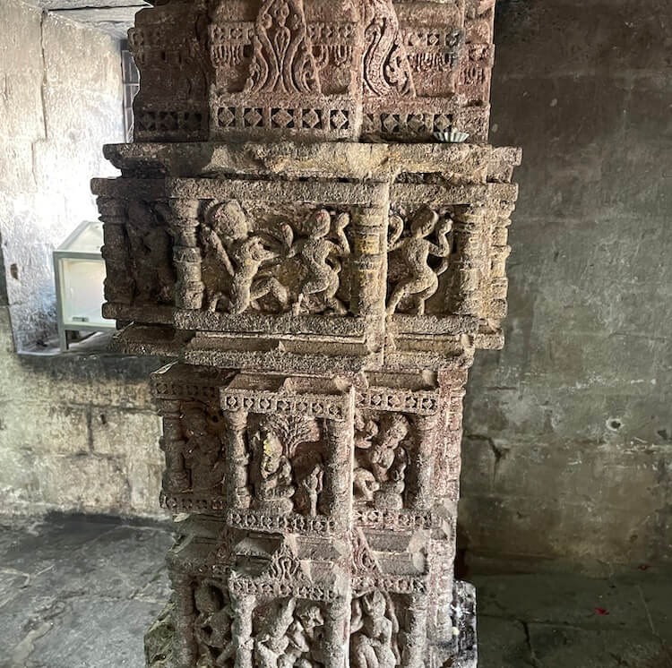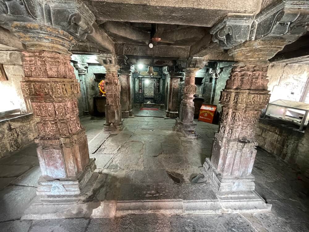 या स्तंभांच्या मध्यभागी जमिनीवर रंगशिळा आहे. हे सर्व स्तंभ दगडी स्तंभपादांवर उभे असून त्यावर देव-देवतांची शिल्पे व वैशिष्ट्यपूर्ण नक्षीकाम आहे. सभामंडपाच्या वितानावरही कोरीव काम आहे. अंतराळाच्या दर्शनी भिंतीत डावीकडील देवकोष्ठकात गणेशाची मूर्ती आहे, तर उजवीकडे शिवलिंग आहे. गर्भगृहाच्या प्रवेशद्वाराच्या द्वारस्तंभांवर तसेच द्वारपट्टीवर सुंदर नक्षीकाम आहे. द्वारस्तंभाच्या दोन्ही बाजूंना शिल्पे कोरलेली आहेत. प्रवेशद्वाराच्या द्वारपट्टीवर मध्यभागी असलेल्या ललाटबिंबावर गणेशाचे स्थान आहे. प्रवेशद्वाराच्या पायथ्याशी दोन्ही बाजूंना कीर्तिमुखे कोरलेली आहेत. अंतराळातून तीन पायऱ्या उतरून गर्भगृहात प्रवेश होतो. या गर्भगृहात मध्यभागी मोठ्या आकाराच्या शाळुंकेमध्ये रामेश्वराची प्राचीन पिंडी आहे.