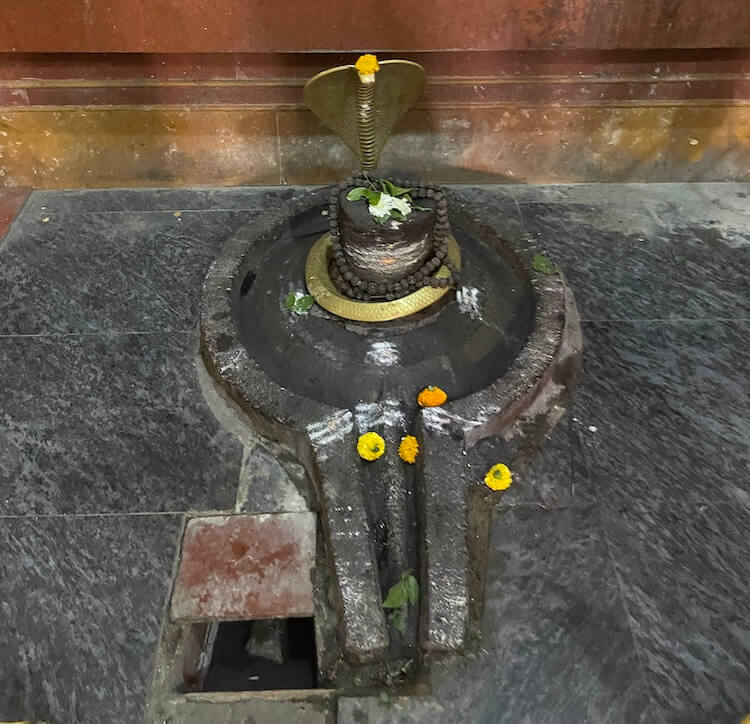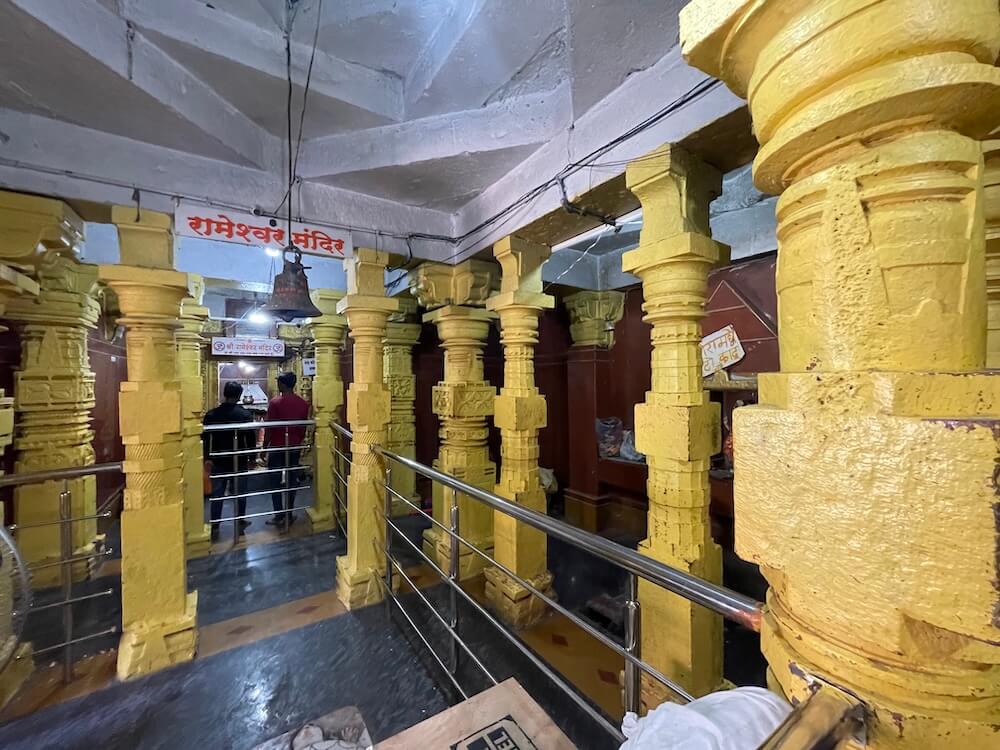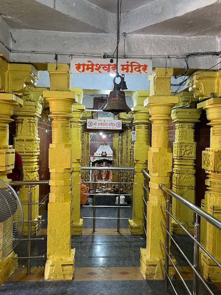 येथून पुढे अंतराळ व त्यापुढे गर्भगृहाचे सात द्वारशाखा असलेले प्रवेशद्वार आहे. द्वारशाखांवर खालील बाजूस द्वारपाल, द्वारपालिका, गंगा, यमुना यांची शिल्पे आहेत व वरील बाजूस नरशाखा, व्यालशाखा, पर्णलताशाखा, पुष्पलताशाखा आणि स्तंभशाखा आहेत. ललाटबिंबावर गणपती शिल्प आहे व ललाटपट्टीवर पानाफुलांचे नक्षीकाम केलेले आहे. गर्भगृहात जमिनीवर मध्यभागी शिवपिंडी आहे. शिवपिंडीवर छत्र धरलेला पितळी नाग आहे. या वालुकामय शिवपिंडीची स्थापना श्रीरामाने केली होती, असे सांगितले जाते. गर्भगृहात मागील भिंतीजवळ वज्रपीठावर श्रीराम, लक्ष्मण व सीता यांच्या संगमरवरी मूर्ती आहेत.