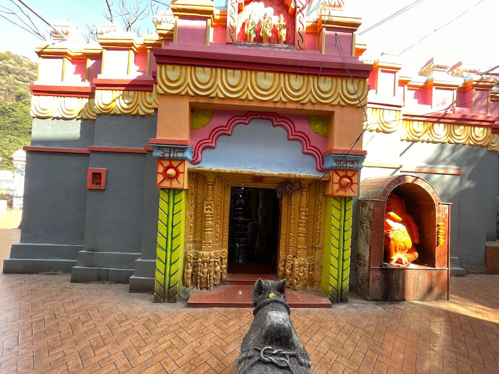 सभामंडपाच्या प्रवेशद्वारासमोर नंदीची काळ्या पाषाणातील मूर्ती आहे. सभामंडपाच्या प्रवेशद्वाराच्या उजव्या बाजूला मेघडंबरीत श्री गणेशाची शेंदूरचर्चित पाषाण मूर्ती आहे. मेघडंबरीच्या उजव्या बाजूला श्रीरामाची प्राचीन मूर्ती आहे. ही या मंदिरातील मूळ मूर्ती आहे व मंदिरात नव्या मूर्ती स्थापित केल्यानंतर ही प्राचीन मूर्ती प्रवेशद्वाराजवळ स्थापित करण्यात आली असल्याचे सांगितले जाते. सभामंडपाचे प्रवेशद्वार पंचशाखीय आहे. द्वारशाखांवर खालील बाजूस द्वारपाल व द्वारपालिका शिल्पे आहेत, तर वरील भागावर नरशाखा, वेलबुट्टीशाखा, पर्णलताशाखा, पुष्पलताशाखा व स्तंभशाखा आहेत. ललाटबिंबावर गणेश शिल्प व ललाटपट्टीवर पुष्पलतेचे नक्षीकाम केलेले आहे. सभामंडपास डाव्या बाजूला आणखी एक प्रवेशद्वार आहे व या प्रवेशद्वाराच्या समोर देखील नंदी शिल्प आहे. या प्रवेशद्वारास तीन द्वारशाखा आहेत. द्वारशाखांवर खालील बाजूस द्वारपाल शिल्पे आहेत. द्वारशाखांवर पानाफुलांचे आणि स्तंभांचे नक्षीकाम आहे. ललाटबिंबावर गणपती शिल्प व ललाटपट्टीवर संयुक्त नक्षीकाम आहे.