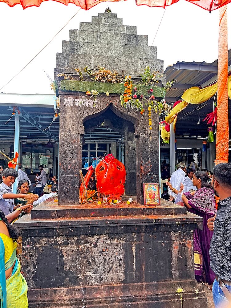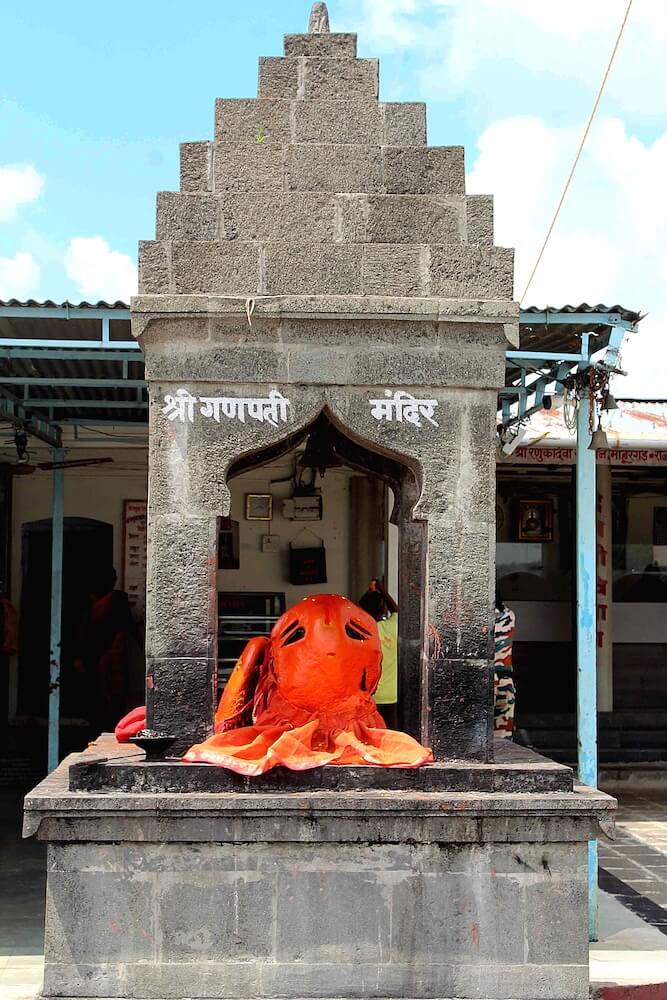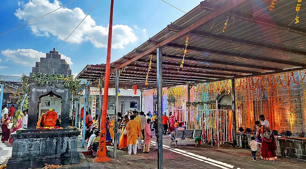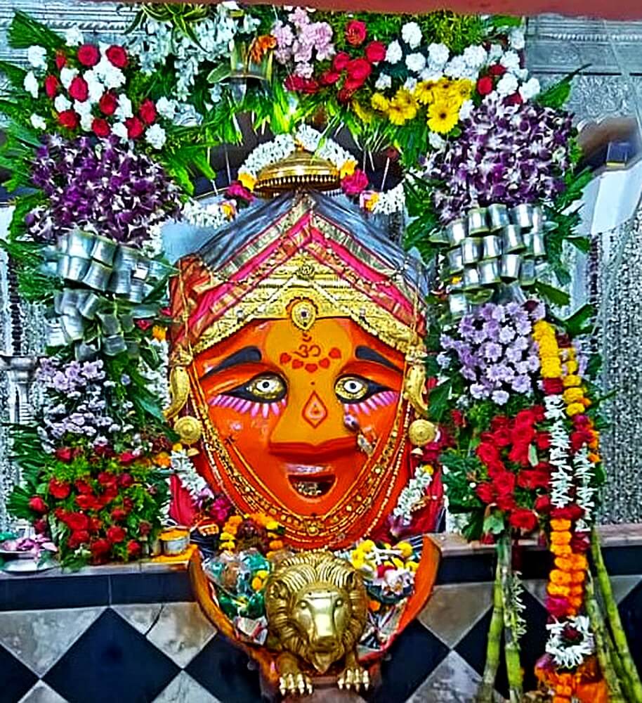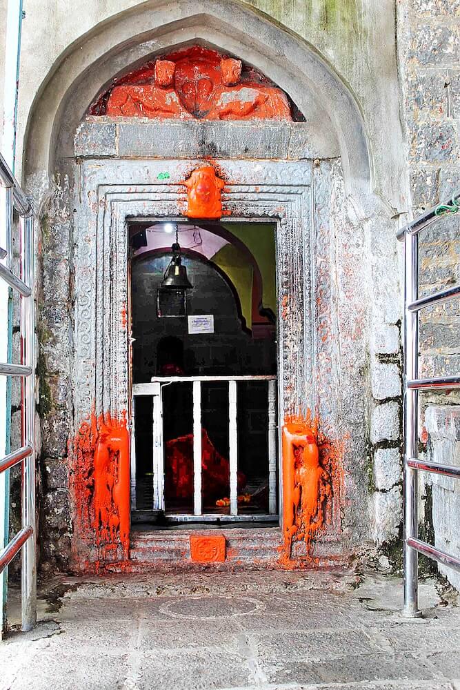 या मंदिराच्या सभामंडपात मोठे दगडी स्तंभ आहेत व वरील बाजूला ते एकमेकांशी महिरपी कमानीने जोडलेले आहेत. या खांबांवर आणि छतावर काही ठिकाणी जुन्या कलाकुसरीचे अवशेष दिसतात. येथील गर्भगृहाची रचना ही एखाद्या गुहेप्रमाणे किंवा कपारीसारखी आहे. या गर्भगृहाचे प्रवेशद्वार चांदीने मढविलेले आहे. गर्भगृहात मध्यभागी देवीची तांदळा स्वरूपातील शेंदूरचर्चित मूर्ती (मुखवटा) आहे. हा मुखवटा सुमारे पाच फूट उंच आणि चार फूट रुंद आहे. देवीला सोन्या-चांदीचे विविध दागिने, नथ आणि कर्णफुले यांनी सजवले जाते. येथे देवीचे केवळ मुखच पूजले जाते, कारण धड हे जमिनीखाली गुप्त असल्याची मान्यता आहे. या मंदिरापासून काही दुसऱ्या मार्गावरील काही पायऱ्या उतरून पायथ्याशी असलेल्या परशुराम मंदिरात जाता येते. या मंदिरात दररोज आलेल्या भाविकांसाठी महाप्रसादाची सुविधा असते.
