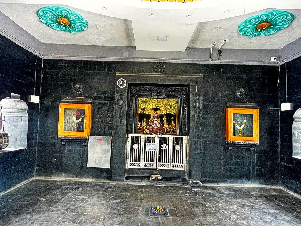 पाषाणमूर्ती आहे. वज्रपिठाच्या दोन्ही बाजूंना पितळी समया आहेत. गर्भगृहातून बाहेर पडण्यासाठी उजव्या बाजूला प्रवेशद्वार आहे. गर्भगृहाचे वितान नक्षीदार अष्टकोनी आहे.
