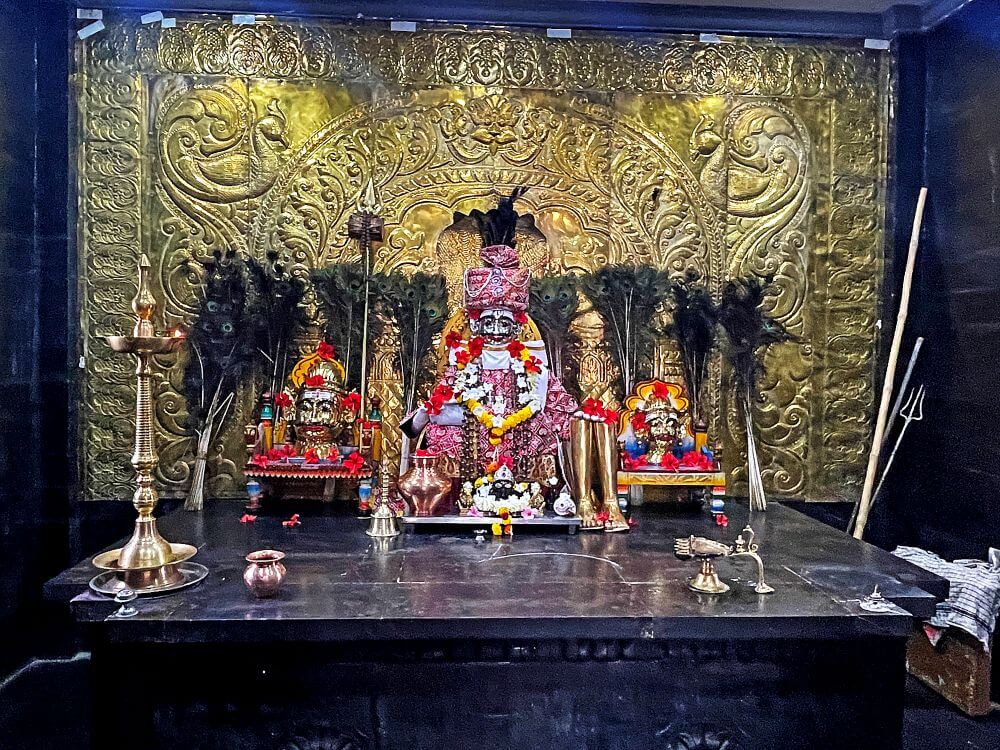 गर्भगृहात वज्रपिठावर मखर व त्यात देवाचा मुखवटा आहे. येथे देवाची सिंहासनारूढ, अश्वारुढ अशी विविध रूपात पूजा बांधली जाते. देवास उंची वस्त्रे, अलंकार व डोक्यावर फेटा परिधान केलेला असतो. येथे देवाची पितळी पदकमले ठेवलेली आहेत. देवाच्या मागे चांदीच्या प्रभावळीवर मध्यभागी कीर्तिमुख आहे. दोन्ही बाजूंना पानाफुलांच्या नक्षी आहेत. मखराच्या दोन्ही बाजूंस उत्सव काळात व पालखी मिरवणुकीत वापरले जाणारे देवाचे पितळी मुखवटे आहेत. वज्रपिठासमोर खालील बाजूस मारूतीची शेंदूरचर्चित