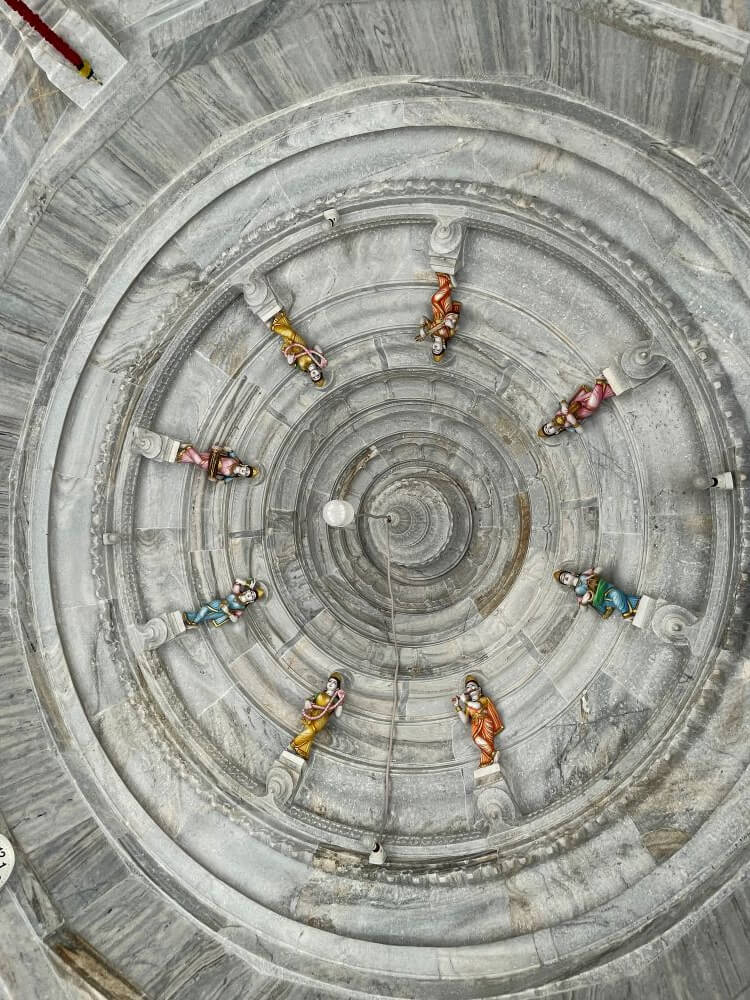गणपती आपले माता-पिता शंकर-पार्वती यांना भेटण्यासाठी भव्य मिरवणुकीने जातात. ती मिरवणूक शिवपार्वतीच्या महालासमोर आली असताना प्रवेशद्वारी सूर्यमूषक व चंद्रमूषक त्यांचे स्वागत करतात, अशी या मंदिराची संकल्पना आहे. वाहनतळापासून काहीशा उंचावर असलेल्या मंदिराच्या प्रांगणात मंदिरासमोर एक विहीर व त्यावर सुंदर कारंजे बसविलेले आहे. याशिवाय प्रांगणात दोन अष्टसिद्धी मंगल दीपस्तंभ व दोन तुळशी वृंदावने आहेत. दीपस्तंभांवर ओम, श्री, स्वस्तिक, शंकर, त्रिशूल, कमळ, दीप व मंगल कलश ही आठ शुभचिन्हे कोरलेली आहेत. एखादा राजवाडा भासावा अशी या मंदिराची रचना आहे. मंदिराभोवती असलेल्या मोठ्या संगमरवरी आवारभिंतीत नक्षीदार खिडक्या व खालील बाजूस हत्ती, घोडे व उंट यांची शिल्पे असलेली रांग आहे.