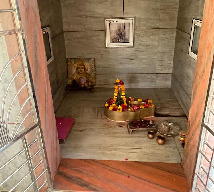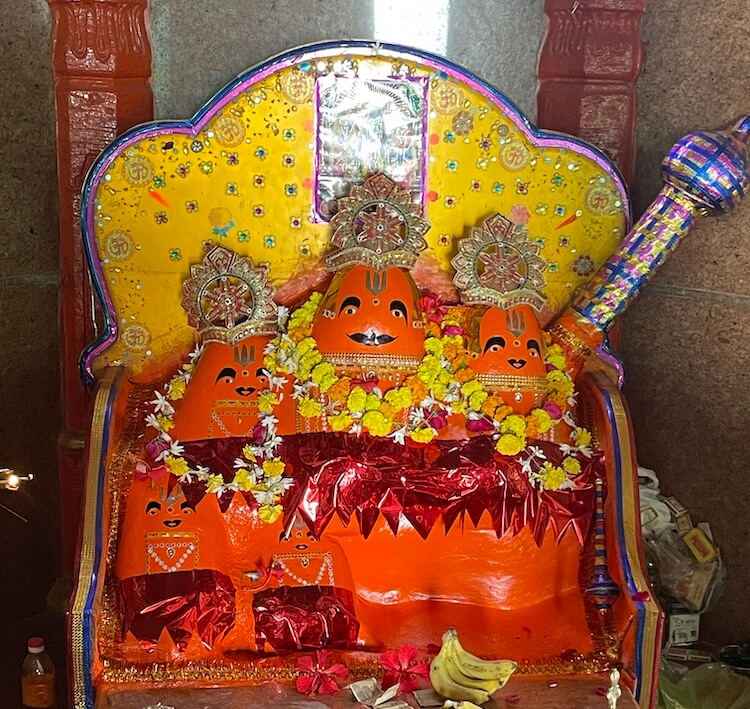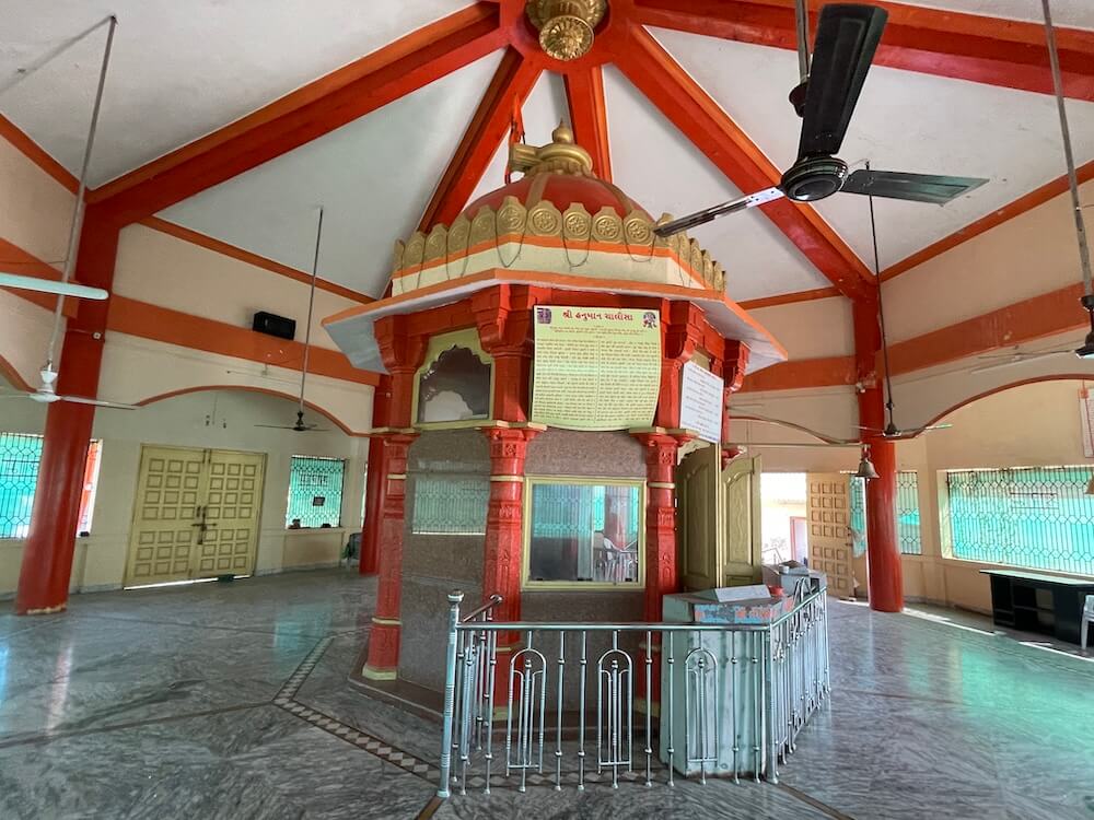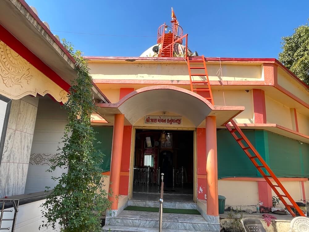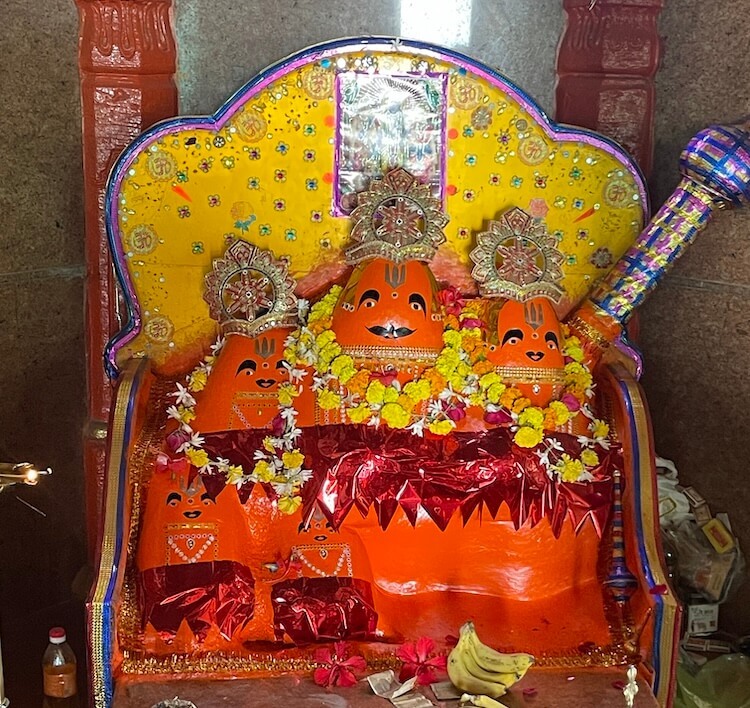An elongated single-storey structure marks the entrance to the inner precincts, where the Runmochan Hanuman temple stands. Built upon a high Jagati (plinth), the temple features a unique architectural design. It possesses a magnificent octagonal Sabhamandap (assembly hall) of a semi-open, modern design. This hall has three entrances and is crowned by a massive domed spire featuring an Amalaka (stone disc) and a Kalasha (pinnacle). Within this assembly hall resides the original, smaller stone temple. This ancient octagonal structure features pillars with intricate carvings and its own domed roof. Notably, a ‘Shivpind’ sits atop this inner roof in place of a pinnacle. Inside, within a marble canopy, is the Panchmukhi Hanuman idol. The vermilion-smeared stone features three faces on the upper section and two on the lower, with eyes,