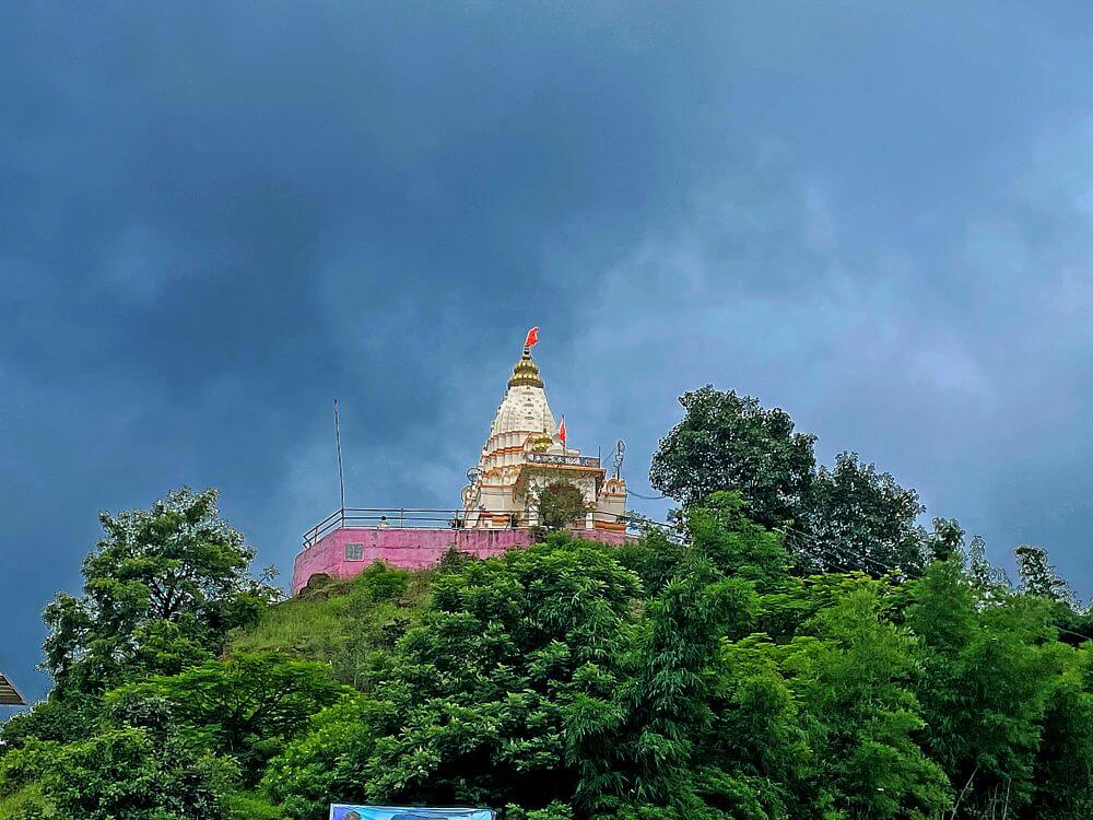 हे मंदिर उंच टेकडीवर असल्यामुळे या परिसरातून कुठूनही त्याचे दर्शन होते. डोंगरगावपासून काही अंतरावर मंदिराकडे जाण्याची वाट लागते. तेथील उंच लोखंडी वेशीतून काही अंतर गेल्यानंतर सर्वप्रथम गणपतीचे मंदिर लागते. अर्धखुला सभामंडप आणि गर्भगृह, त्यावर उंच शिखर अशी या मंदिराची रचना आहे. सभामंडपात उंच चौथऱ्यावर मूषकाची दगडी मूर्ती आहे. गर्भगृहात वज्रपीठावर गणेशमूर्ती विराजमान आहे. तेथे दर्शन घेऊन आणखी वर आल्यानंतर वाहने पार्क करण्यासाठीची जागा आहे. तेथून मंदिराकडे जाण्यासाठी पायऱ्या आहेत. शिवाय हा रस्ताही थेट मंदिरापर्यंत जातो. पायऱ्या सुरू होतात तेथेच बाजूला विठ्ठल–रुक्मिणीचे एक छोटे मंदिर आहे.