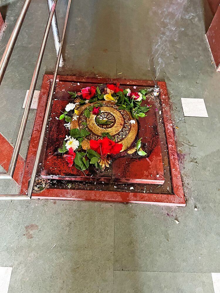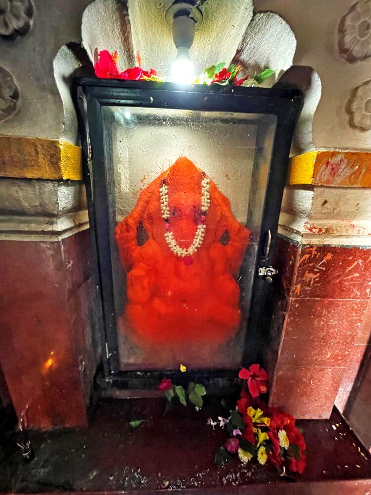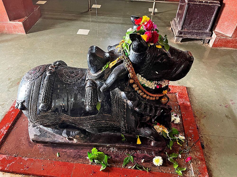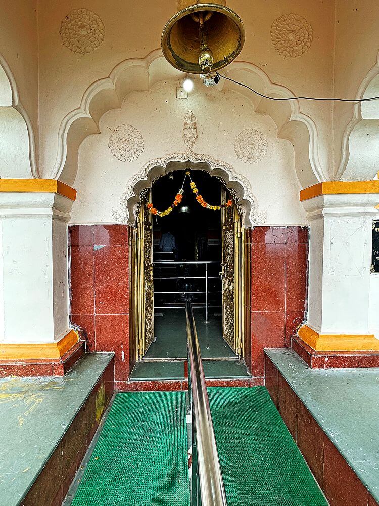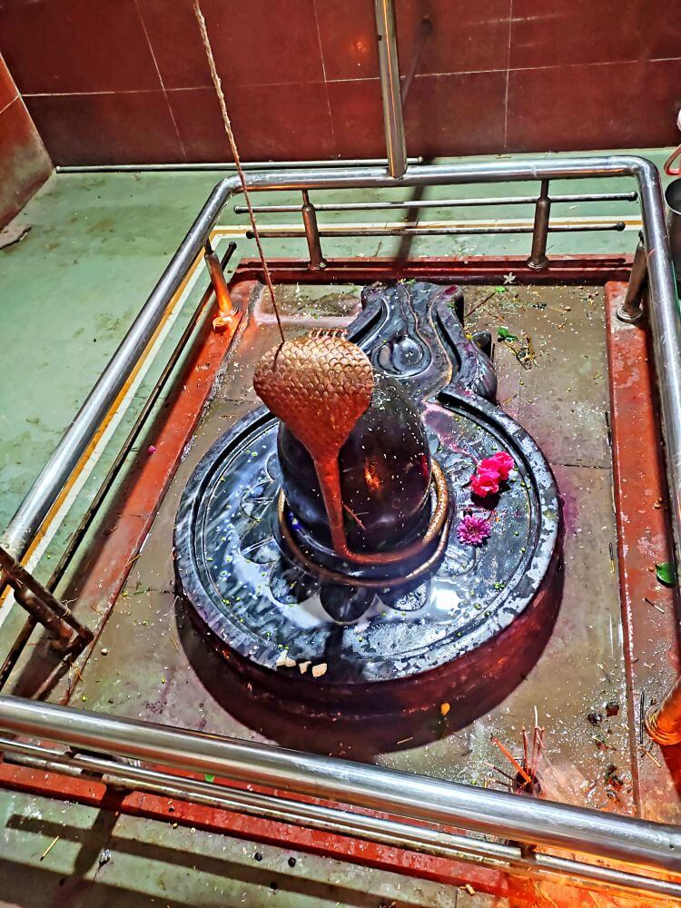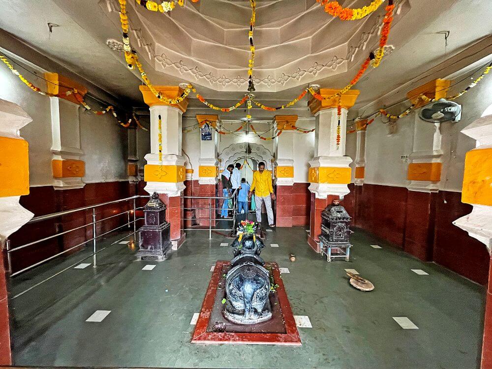 वेशद्वारासमोर लावलेल्या रेलिंगमुळे थेट सभामंडपात जाता येत नाही. या दरवाजातून डाव्या व उजव्या बाजूने गर्भगृहाच्या दारात रांगेने जाण्या–येण्यासाठी रेलिंगने आखलेला मार्ग आहे. गर्भगृहासही महिरपी कमान असलेले प्रवेशद्वार आहे. तेथून पायरी उतरून गर्भगृहात प्रवेश होतो. येथे मध्यभागी जमिनीपासून खाली असलेल्या व स्टिलचे लहान रेलिंग लावलेल्या चौकोनात शिवपिंडी आहे. या पिंडीची शाळुंका मीनाकृती आहे व दंडगोल लिंगावर फणा उभारलेल्या नागाची मूर्ती आहे. गर्भगृहाच्या बाजूस गणेशाची मूर्ती आहे.
