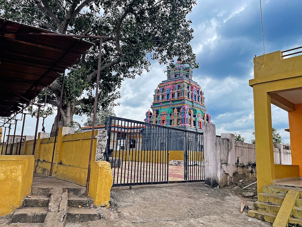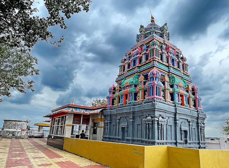 मंदिराच्या छताला चहूबाजूने उतरता नक्षीदार सज्जा व कठडा आहे. गर्भगृहाच्या छतावर लहान-लहान होत जाणाऱ्या पायऱ्यांच्या रचनेचे, द्रविड शैलीतील उरुशृंगी प्रकाराचे, तीन थरांचे चौकोनी शिखर आहे. शिखरातील प्रत्येक थरात कोनांवर उभ्या शिखरांची मंदिर शिल्पे म्हणजे ‘कुट’ व मधल्या भागात आडव्या शिखरांची मंदिर शिल्पे म्हणजेच ‘शाल’ आहेत. शिखराच्या शीर्षभागी स्तुपी व त्यावर कळस आहे.