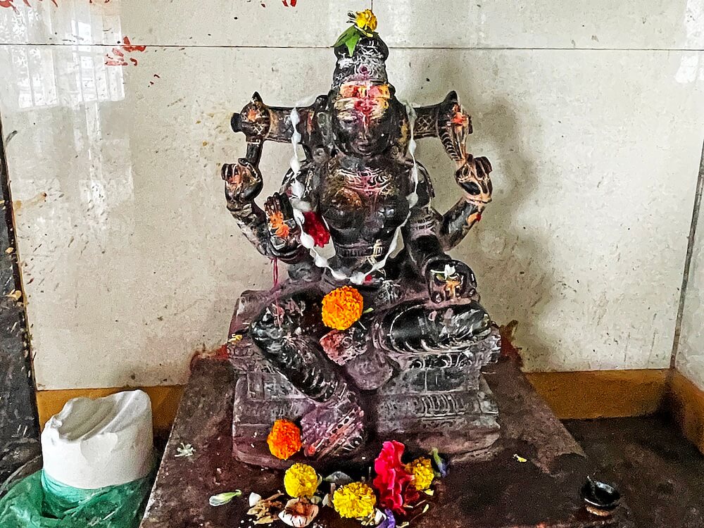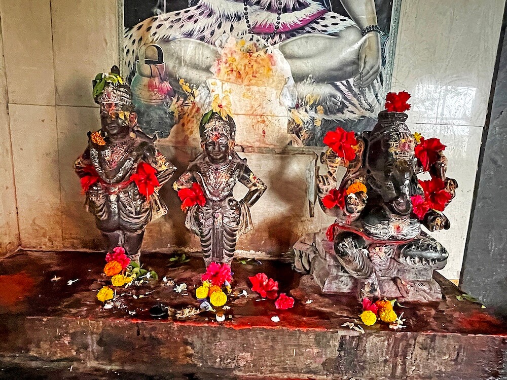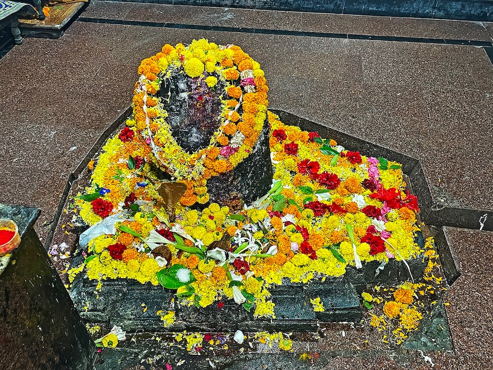 गर्भगृहाच्या मध्यभागी जमिनीवर शिवपिंडी आहे. शिवपिंडीवर छत्र धरलेला पितळी पंचफणी नाग असून त्याच्या वर छताला जलधारेसाठी अभिषेक पात्र टांगलेले आहे. गर्भगृहाच्या मागील भिंतीत खिडकी आहे. अशी समजूत आहे की पूर्वी या खिडकीतून वाहिलेले पूजा साहित्य व अभिषेक जल गर्भगृहातील या शिवपिंडीवर पडत असे. गर्भगृहाच्या बाहेरील भिंतींवर कोरीव पाषाणात विविध भौमितिक नक्षी कोरलेल्या आहेत. गर्भगृहाच्या सभोवती फरशी बसवलेला प्रदक्षिणा मार्ग आहे.
