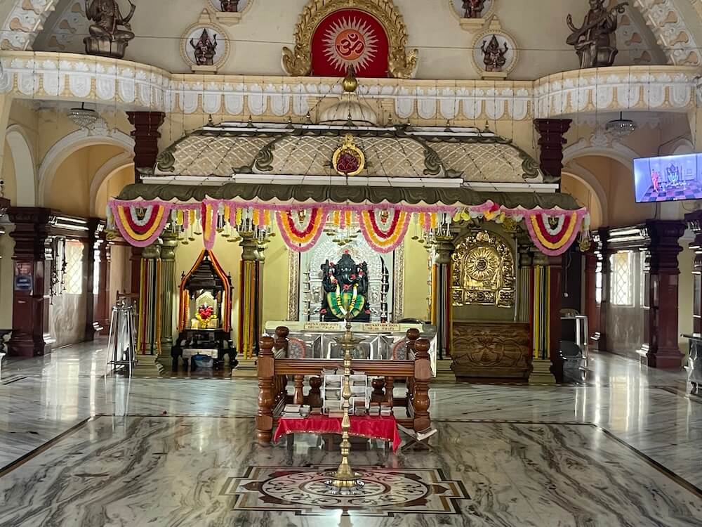 पुढे रांगेत तीन गर्भगृहे आहेत. मधल्या मुख्य गर्भगृहाचे प्रवेशद्वार लाकडी असून द्वारशाखांवर पानाफुलांच्या नक्षी आहेत. प्रवेशद्वारास नक्षीदार लाकडी झडपा आहेत. या गर्भगृहात वज्रपिठावर गणेशाची काळ्या पाषाणातील मोठी चतुर्भुज मूर्ती आहे. देवाच्या मागील दोन हातात परशू व अंकुश असून पुढील एका हातात मोदक आहे. गणपतीचा चौथा हात आशीर्वाद मुद्रेत आहे. देवाचे नेत्र, सोंड व कर्ण चांदीच्या आवरणाने आच्छादित आहेत व डोक्यावर चांदीचा मुकुट आहे. गणपतीच्या मागे चांदीच्या प्रभावळीतील स्तंभांवर खाली गणपतीचे वाहन मूषक प्रतिमा व वर रिद्धी सिद्धी शिल्पे कोरलेली आहेत. प्रभावळीत पानाफुलांची नक्षी असलेले तोरण आहे. वज्रपिठासमोर चांदीच्या समई आहेत.