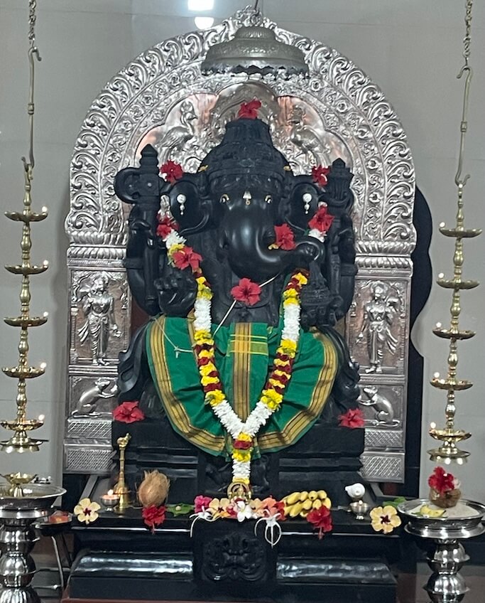 मुख्य गर्भगृहाच्या डावीकडील गर्भगृहात वज्रपिठावर गणेशाची काळ्या पाषाणातील उत्सवमूर्ती आहे. येथे भाविकांना स्वहस्ते देवाची पूजा करता येते. उजव्या बाजूच्या गर्भगृहात विशाल शिवपिंडी व त्यामागील भिंतीलगत पितळी वज्रपिठावर महादेवाचा पितळी मुखवटा आहे. या गर्भगृहाच्या प्रवेशद्वारासमोर नंदीची काळ्या पाषाणातील मूर्ती आहे. या गर्भगृहाच्या मागील बाजूला स्वतंत्र गर्भगृहात वज्रपिठावर सत्यनारायणाची मूर्ती आहे. या गर्भगृहाच्या शेजारी चांदीचा मखर असून येथे भाद्रपद महिन्यात २१ दिवसांच्या गणेशोत्सव काळात पार्थिव गणेश मूर्तीची स्थापना करण्यात येते. मुख्य गर्भगृहाच्या छतावर उंच लंबगोलाकार शिखर आहे. या शिखराच्या शीर्षभागी आमलक व कळस आहे. डाव्या व उजव्या बाजूला गर्भगृहाच्या छतावर सारख्याच रचनेची परंतु तुलनेने लहान शिखरे आहेत.