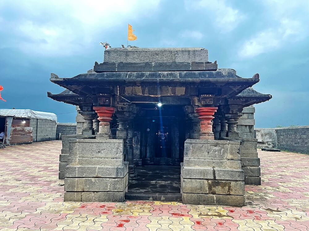 गावाच्या प्रवेशद्वारावर सिमेंट काँक्रिटने बांधलेली मंदिराची आधुनिक पद्धतीची स्वागतकमान आहे. या स्वागतकमानीच्या दोन्ही बाजूस दोन चौकोनी स्तंभ व त्यावरील तुळईवर घुमट आहे. गावातून मंदिरापर्यंत येण्यासाठी पक्की सडक आहे. मंदिराभोवती कोरीव दगडात बांधलेली सुमारे सात फूट उंच व दोन फूट रुंद अशी भक्कम तटबंदी असून या तटबंदीत मंदिराचे मुख्य प्रवेशद्वार आहे. रस्त्यांपेक्षा खोलगट असलेल्या मंदिराच्या पेव्हर ब्लॉकने आच्छादित प्रांगणात उतरण्यासाठी कोरीव पाषाणात बांधलेल्या नऊ पायऱ्या आहेत.