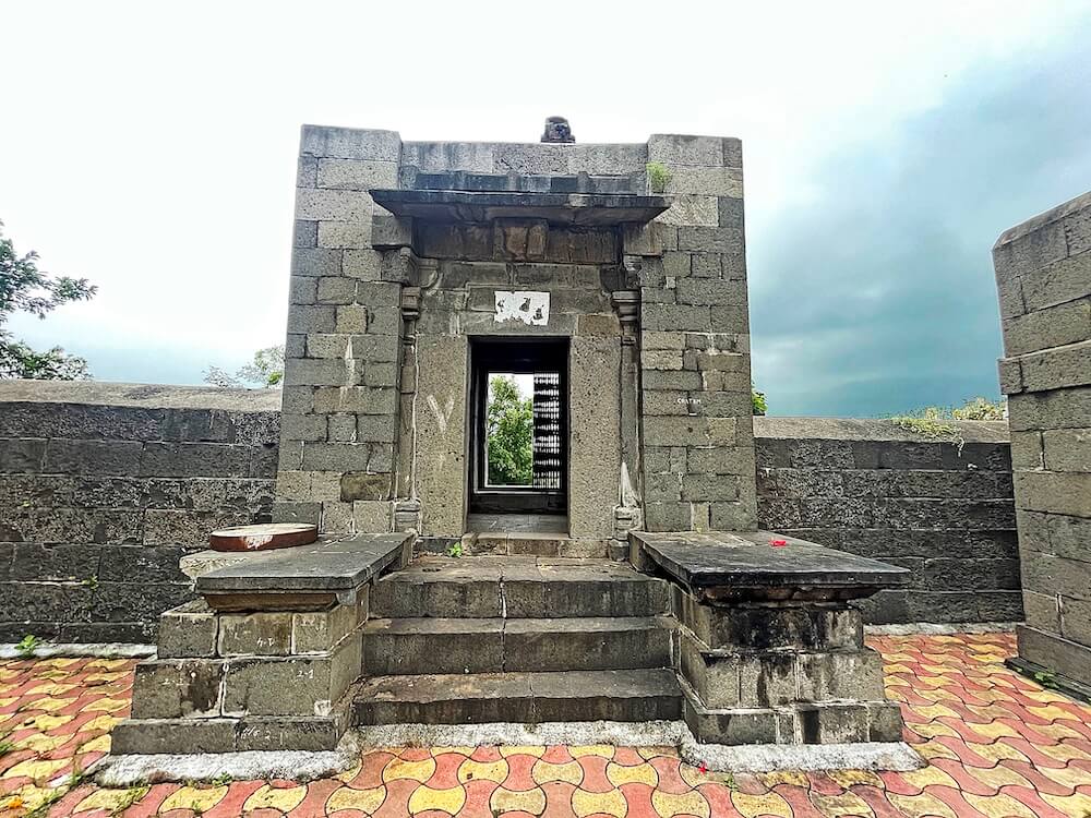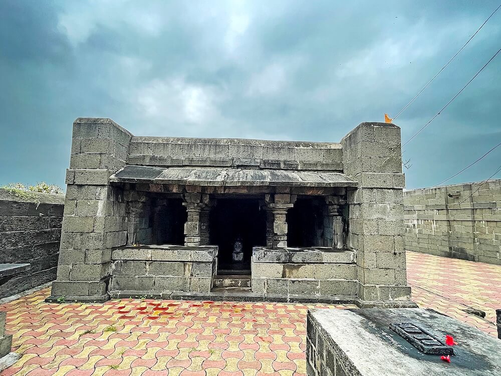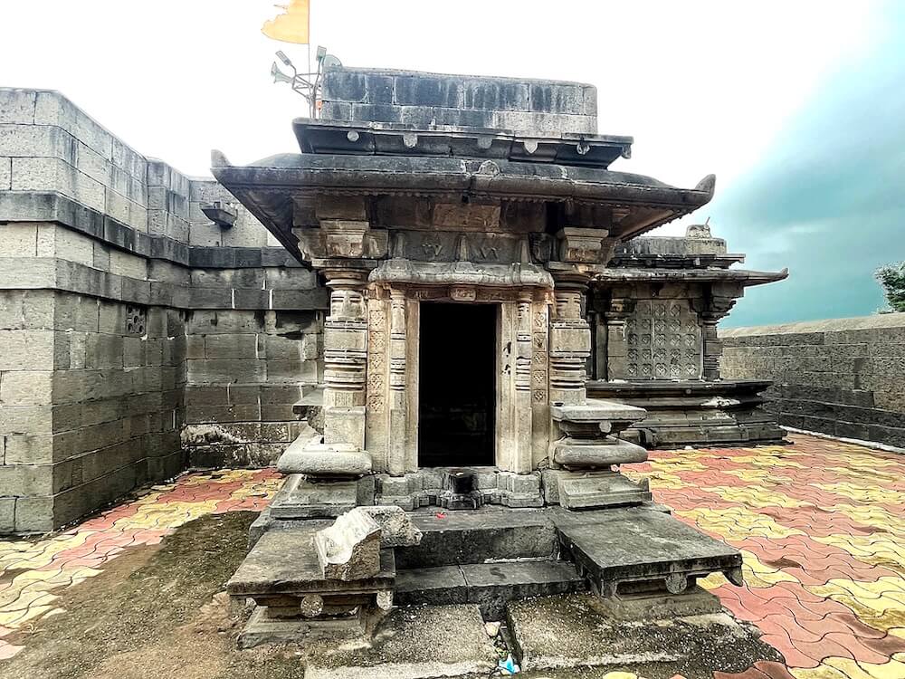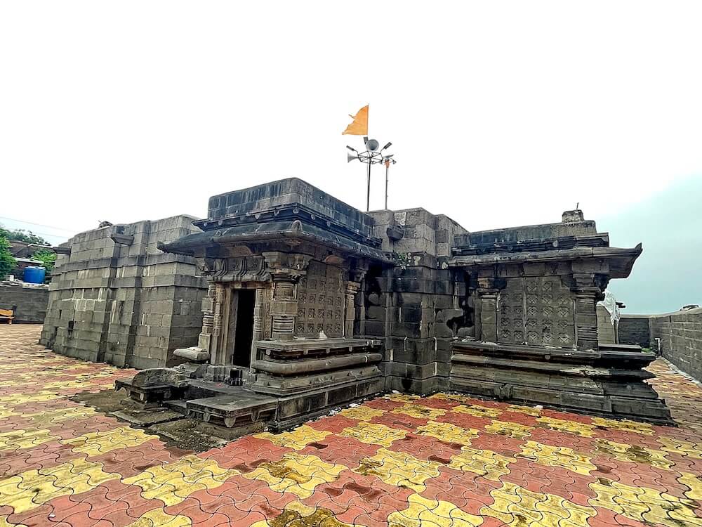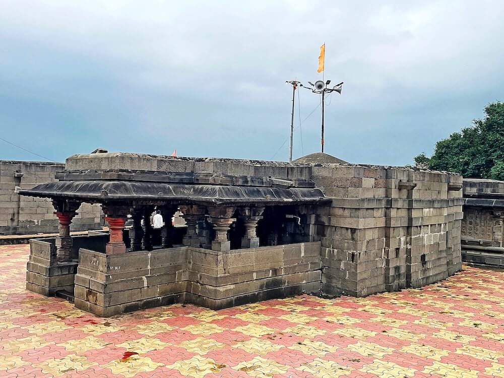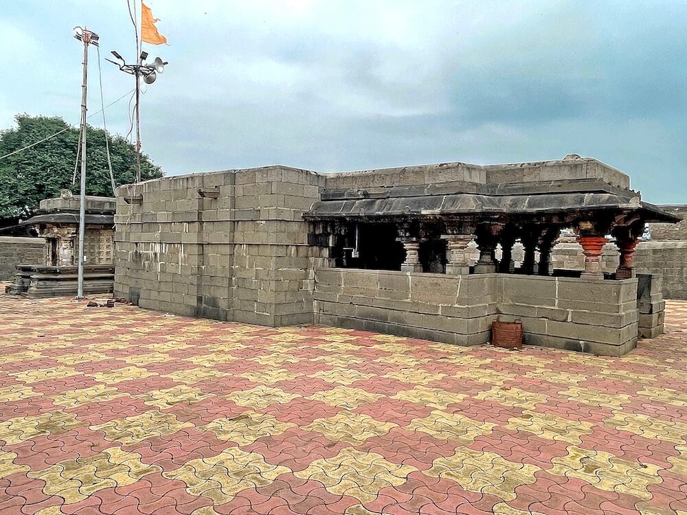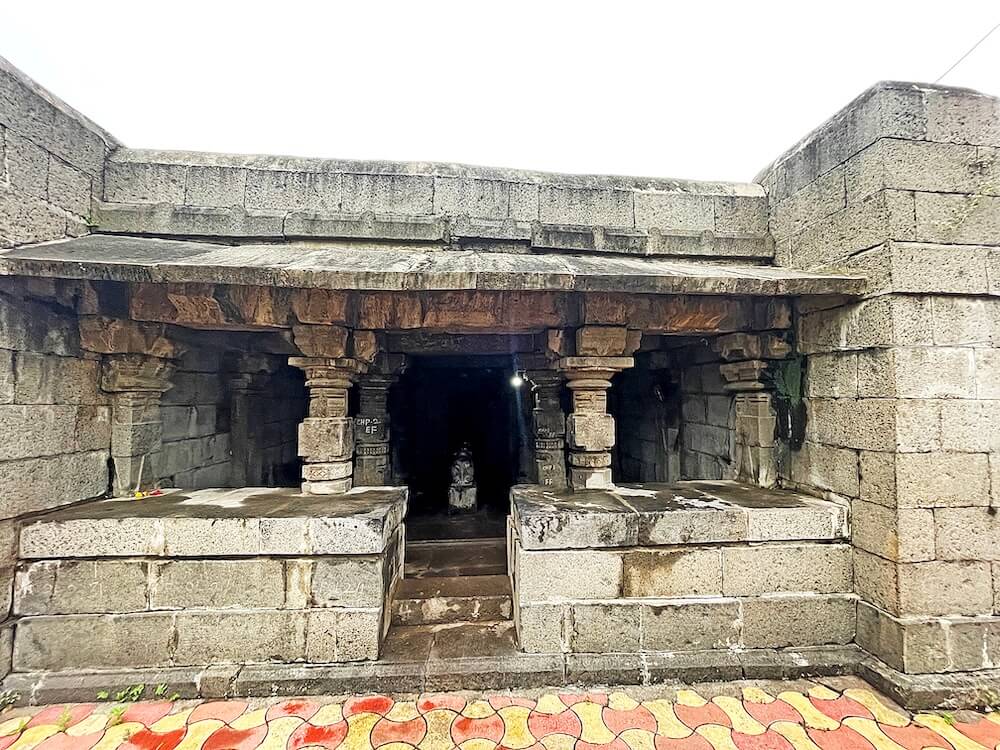 गावाच्या प्रवेशद्वारावर सिमेंट काँक्रिटने बांधलेली मंदिराची आधुनिक पद्धतीची स्वागतकमान आहे. या स्वागतकमानीच्या दोन्ही बाजूस दोन चौकोनी स्तंभ व त्यावरील तुळईवर घुमट आहे. गावातून मंदिरापर्यंत येण्यासाठी पक्की सडक आहे. मंदिराभोवती कोरीव दगडात बांधलेली सुमारे सात फूट उंच व दोन फूट रुंद अशी भक्कम तटबंदी असून या तटबंदीत मंदिराचे मुख्य प्रवेशद्वार आहे. रस्त्यांपेक्षा खोलगट असलेल्या मंदिराच्या पेव्हर ब्लॉकने आच्छादित प्रांगणात उतरण्यासाठी कोरीव पाषाणात बांधलेल्या नऊ पायऱ्या आहेत.