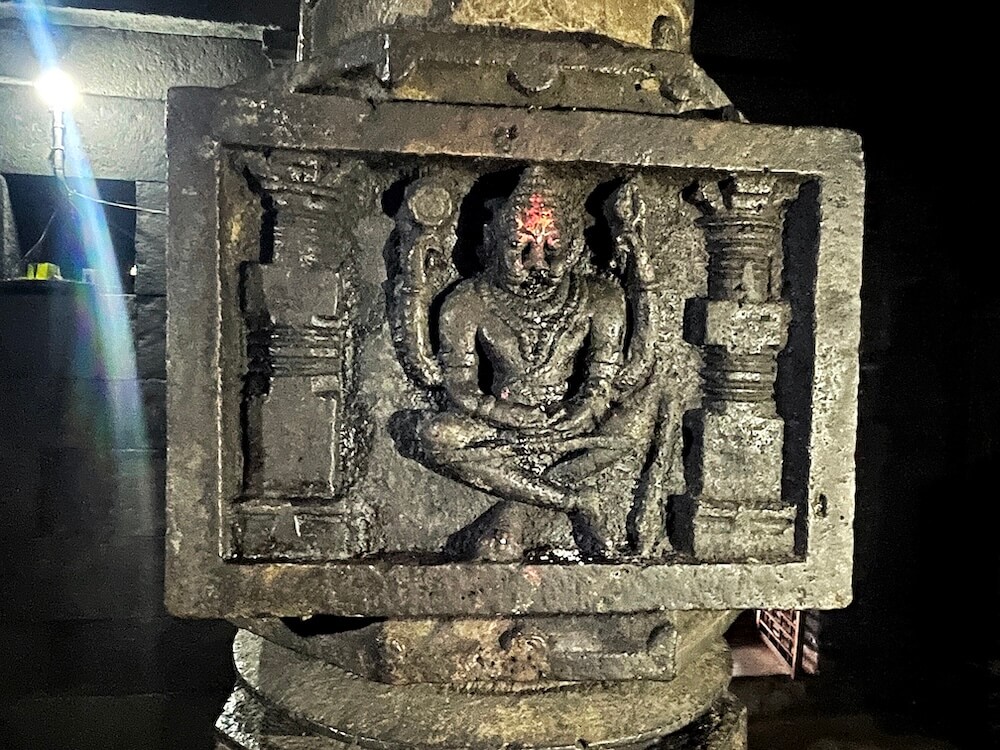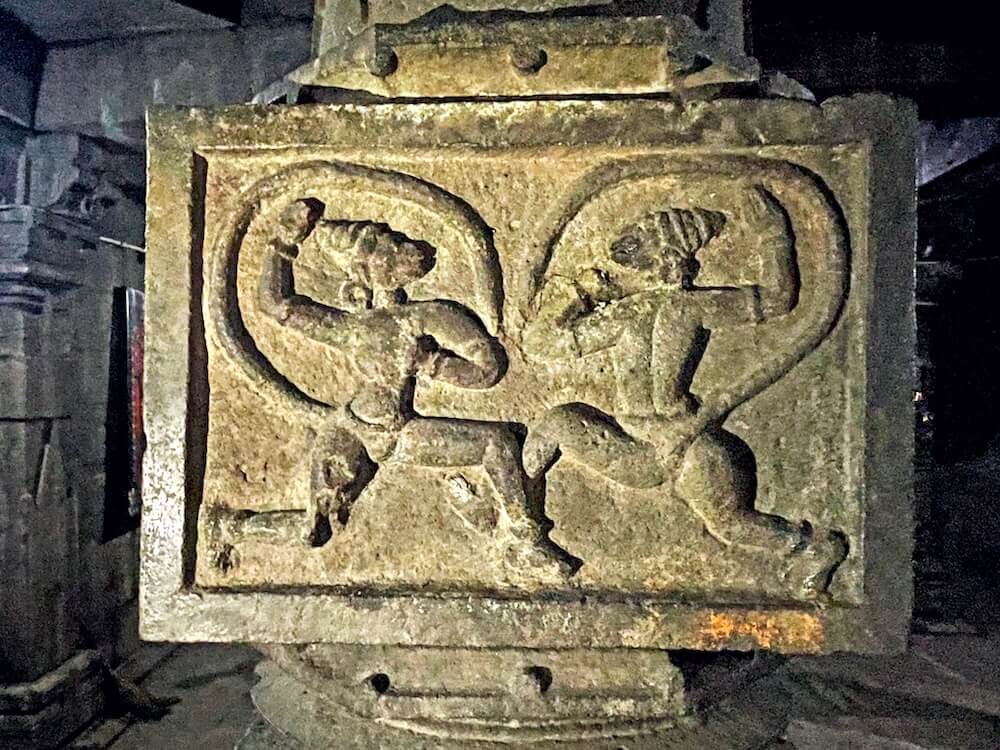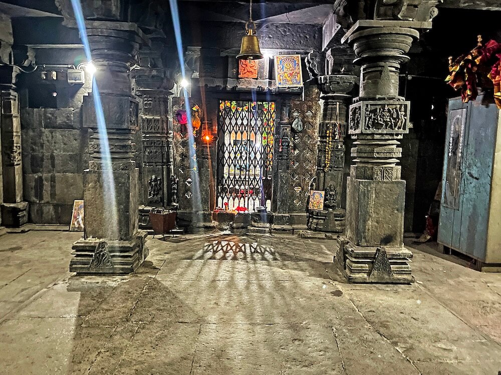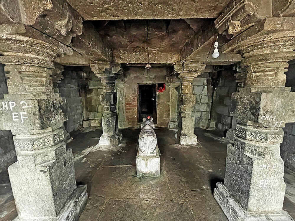 द्वारशाखेच्या तळाशी चंद्रशीला व दोन्ही बाजूस कीर्तिमुख शिल्पे आहेत. उत्तरांगावर शिखरशिल्पांचे तोरण आहे. मुख्य सभामंडपात प्रत्येकी तीन नक्षीदार स्तंभांच्या चार रांगा आहेत. बाह्य बाजूचे स्तंभ भिंतीत आहेत. वितानावर चक्राकार नक्षी व झुंबर साकारलेली आहेत. येथील स्तंभदंडातील चौकोनी भागावर चारही बाजूंना रामायण-महाभारतातील प्रसंग, देवी-देवता व कीर्तिमुखे कोरलेली आहेत. एका स्तंभावर हिरण्यकश्यपूचे पोट फाडणारा नृसिंह कोरलेला आहे.