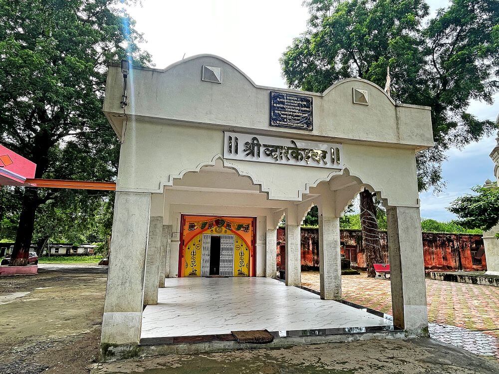 मंदिर परिसरात वटवृक्षासह अनेक प्राचीन वृक्ष आहेत. येथे असलेल्या द्वारकेश्वर मंदिराबाबत अख्यायिका अशी की रुक्मिणी हरण करून जात असताना श्रीकृष्ण वाटेत अनेक ठिकाणी थांबले. त्यापैकी एक असलेल्या या ठिकाणी हे मंदिर आहे. या मंदिरासमोर एक दीपमाळ आहे. खुला सभामंडप, अंतराळ व गर्भगृह अशी या मंदिराची रचना आहे. काही वर्षांपूर्वी झालल्या जिर्णोद्धारानंतर या मंदिराला सध्याचे स्वरूप प्राप्त झालेले आहे. अंतराळात मध्यभागी एका चौथऱ्यावर नंदीची पाषाणी मूर्ती आहे. गर्भगृहाच्या प्रवेशद्वारावर भाऊसाहेब महाराज ऊर्फ देवमास्तरांची प्रतिमा आहे. गर्भगृहात मोठ्या शाळुंकेमध्ये द्वारकेश्वर महादेवाची पिंडी आहे.