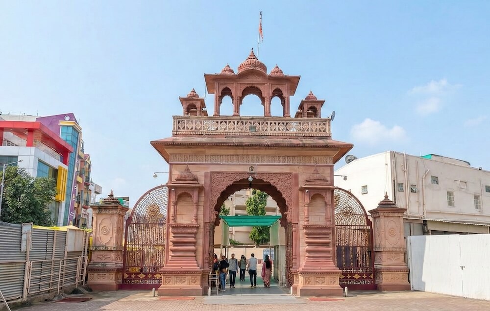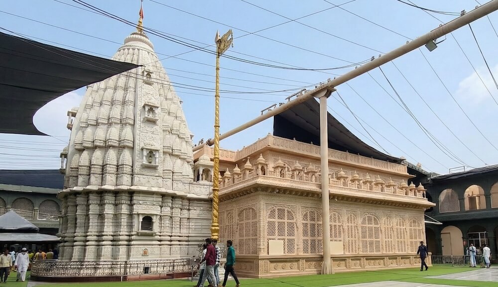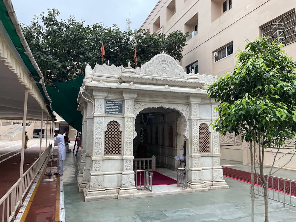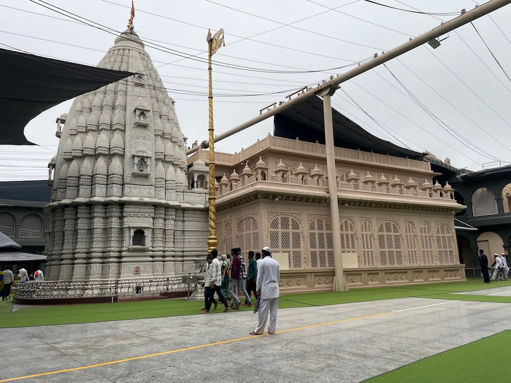 मंदिर परिसरास भक्कम दगडांनी घडवलेले प्रवेशद्वार आहे. त्यावर कठडा असलेला सज्जा आहे. मुख्य दाराच्या दोन्ही बाजूंना आणखी दोन लोखंडी लहान दरवाजे आहेत. आत प्रवेश केल्यानंतर सुरक्षा चौकी आहे. येथून मुख्य मंदिराजवळ येण्यासाठी इमारतीच्या बाजूने छप्पर असलेली मार्गिका आहे. मुख्य मंदिर परिसरामध्ये आणखी एक मोठे प्रवेशद्वार आहे. या परिसरात समाधी स्थळ, महाराजांचे विश्रांतीस्थळ आणि महाप्रसादालय या तीन महत्त्वाच्या वास्तू आहेत. मुख्य द्वाराच्या उजवीकडे असलेल्या दरवाजातून समाधी स्थळी येण्याचा मार्ग आहे. येथील दर्शन मार्गिकेमध्ये बसण्याची, पाण्याची आणि माफक दरात चहा, कॉफी व दूध घेण्याची व्यवस्था आहे. लहान बाळांना स्तनपानासाठी स्वतंत्र खोल्यांची व्यवस्था आहे. दर्शनबारीमधील प्रत्येक टप्प्यावर सेवेकरी भाविकांना मार्गदर्शन करण्यासाठी सज्ज असतात.