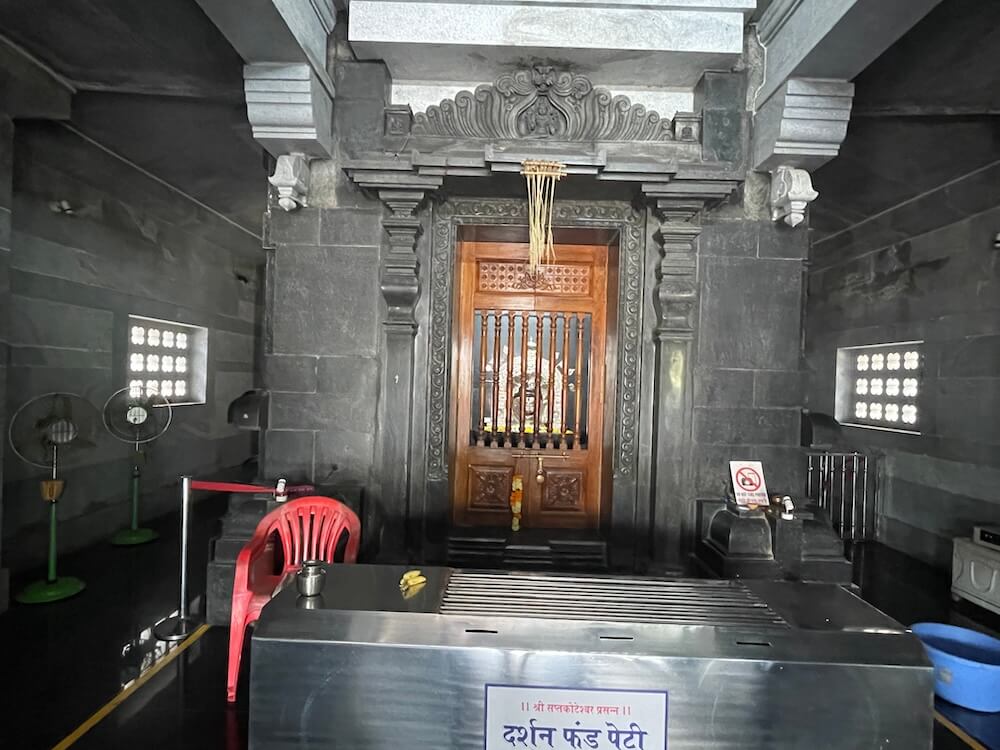 गर्भगृहात उंच वज्रपिठावर सप्तकोटेश्वराची चांदीच्या मोठ्या मुखवटास्वरूपातील मूर्ती प्रतिष्ठापित आहे. मूर्तीमागे सुंदर कोरीवकाम केलेली चांदीची प्रभावळ आहे. त्यावर चांदीचे छत्र, पताका व अन्य धर्मचिन्हे लावलेली आहेत. गर्भगृहावर खाली पायऱ्यांसारखा आकार, त्यावर काहीशी चौकोनाकार रचना व त्याच्या वरच्या भागात छोटासा आमलक आणि त्यावर सुवर्णरंगी कलश असे शिखर आहे. शिखरावर चारही बाजूंनी पर्णाकार देवकोष्ठके आहेत.