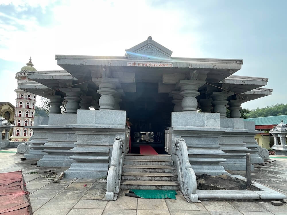 गोवा मुक्तीनंतर येथे असलेल्या मंदिरांचा जीर्णोद्धार सुरू झाला. त्यांतून १९९२ मध्ये येथील शांतादुर्गा देवीच्या मंदिराची पुनर्बांधणी झाली, तर २००४ मध्ये सप्तकोटेश्वराच्या मंदिराची आखणी करण्यात आली आणि २००५ मध्ये त्याचे भूमिपूजन झाले. सप्तकोटेश्वर हे कदंब राजघराण्याची कुलदेवता असल्याने कदंबांनी बांधलेल्या मंदिराप्रमाणेच हे मंदिर असावे, असे नियोजन करण्यात आले. ही शैली द्रविड आणि नागर शैली यांच्या मधली शैली आहे. स्थानिक गोमंतकीय आणि कर्नाटकीय परंपरांचे मिश्रण असलेल्या या शैलीचे एक वैशिष्ट्य म्हणजे त्यातील पाषाणी शिल्पे, संतुलित रचना आणि निसर्ग सुसंगत स्थापत्य. गोव्यात कदंब शैलीतील एकमेव मंदिर सध्या उभे आहे. ते म्हणजे तांबडी सुर्ला येथील महादेव मंदिर. त्या मंदिराच्या स्थापत्याचा संदर्भ या मंदिराच्या उभारणीसाठी घेण्यात आला. ४ ते ८ मार्च २०२५ या कालावधीत या नूतनीकरण केलेल्या भव्य मंदिराचा प्रतिष्ठापना सोहळा पार पडला.