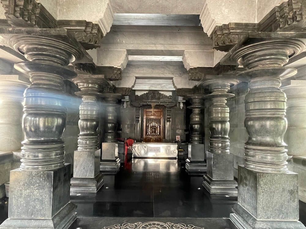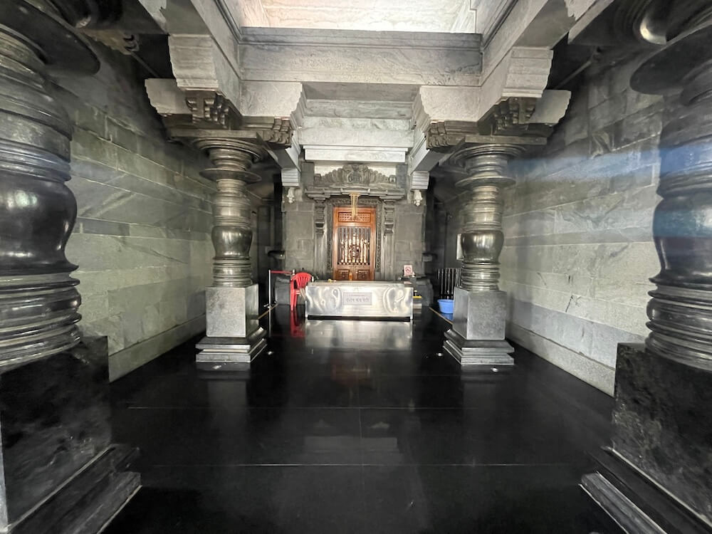 येथून पुढे पाच पायऱ्या चढून मंदिराच्या अर्धखुल्या प्रकारच्या सभामंडपात प्रवेश होतो. सभामंडपाच्या तिन्ही बाजूंनी असे पायरीमार्ग आहेत. सभामंडपास पाषाणाची उतरती छपरे आहेत. छतावर मध्यभागी चौकोनाकार आहे. त्यावर चारही दिशांनी नंदी मूर्ती स्थापित आहेत. एकूण २४ पाषाणी ताशीव स्तंभ असलेल्या या मंदिराच्या सभामंडपात मध्यभागी प्राचीन पद्धतीनुसार रंगशीला आहे. त्यावरील वितानाचा भाग कमलाकृती आहे. गर्भगृहास मोठे दगडी प्रवेशद्वार आहे. त्यात लाकडी गज बसवलेला लाकडी दरवाजा आहे. कोरीव काम केलेल्या द्वारचौकटीच्या उतरांग भागातही कलात्मक नक्षीकाम केलेले आहे. त्यात मध्यभागी शिवशंकराचे शिल्प व त्यावरील भागात कीर्तिमुख आहे.