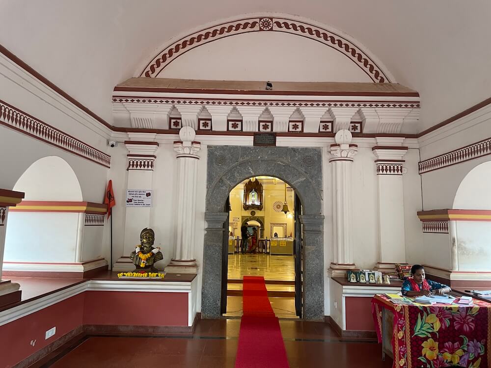याच्या वरच्या भागात मंदिराच्या बांधणीसंबंधीचा, छत्रपती शिवाजी महाराजांचा नामोल्लेख असलेला ऐतिहासिक शिलालेख आहे. या प्रवेशद्वाराच्या डावीकडील बाजूस असलेल्या कक्षासनावर छत्रपती शिवाजी महाराजांचा अर्धपुतळा विराजमान आहे. प्रवेशद्वारातून आत दोन पायऱ्या चढून महामंडपात प्रवेश होतो. महामंडप प्रशस्त आणि उंच आहे. गोमंतकातील मंदिर स्थापत्यशैलीनुसार याची रचना आहे. डाव्या-उजव्या बाजूच्या बाह्यभिंतींपासून आत काही अंतरावर रुंदसर स्तंभांनी निर्माण केलेल्या कमानींची रचना येथेही पाहावयास मिळते. या मंदिराचे आणखी एक वैशिष्ट्य म्हणजे येथील भिंतींवर, स्तंभांवर, कमानींवर असलेले कावी कला प्रकारातील नक्षीकाम. हे कामही पारंपरिक रंग वापरून, जुन्या पद्धतीने केलेले आहे. महामंडपातील स्तंभांवर, तसेच छतावर दिव्यांकरीताच्या काचेच्या हंड्या बसवलेल्या आहेत. छतास दोन पितळी घंटा टांगलेल्या आहेत. अंतराळाची उंच दर्शनीभिंतही कावी नक्षीकामाने सुशोभित आहे. या भिंतीवर प्रवेशद्वाराच्या दोन्ही बाजूंनी चौकोनी देवकोष्ठके आहेत. त्यात गणेश आणि हनुमंताच्या दगडी मूर्ती विराजमान आहेत. प्रवेशद्वाराच्या वरच्या बाजूस असलेल्या मोठ्या लाकडी देव्हाऱ्यात सप्तकोटेश्वराची प्रतिमा आहे. प्रवेशद्वाराच्या समोर नंदीची पाषाणातील मूर्ती आहे. गर्भगृहात भूतलावर सप्तकोटेश्वराची पिंडी प्रतिष्ठापित आहे. अन्य मंदिरांतील शिवपिंडीपेक्षा येथील पिंडी वेगळी आणि वैशिष्ट्यपूर्ण आहे. ती भूमीच्या पातळीच्या वर आहे. तिचे ब्रह्मभाग, विष्णूभाग आणि रुद्रभाग असे तीन भाग आहेत. पिंडीच्या खालच्या भागास ब्रह्मभाग म्हणतात. त्यावरचा भाग विष्णूभाग असतो आणि सर्वांत वरच्या भागास रुद्रभाग असे म्हणतात. अनेकदा यातील ब्रह्मभाग आणि विष्णूभाग हे जमिनीत पुरलेले असतात. या मंदिरातील शिवपिंडीत हे दोन्ही भाग भूमीच्या पातळीच्या वर आहेत. या मंदिरातील गर्भगृह अत्यंत वैशिष्ट्यपूर्ण आहे. ते बांधलेले नसून एका मोठ्या शिलाखंडामध्ये कोरलेल्या गुहा स्वरूपातील आहे. त्याच्या वरील भागात या शिळेमध्ये कोरलेलेच एक दालन आहे. त्या दालनात जाण्यासाठी पायऱ्याही कोरलेल्या आहेत. गर्भगृहास प्रदक्षिणा घालताना ही रचना पाहावयास मिळते. मंदिर संवर्धनाच्या कामाच्या वेळी या गर्भगृहाच्या बाह्य बाजूस काचेची भिंत बसवण्यात आली आहे. या गाभाऱ्यावर गोमंतकीय स्थापत्यशैलीतील उंच शिखर आहे.