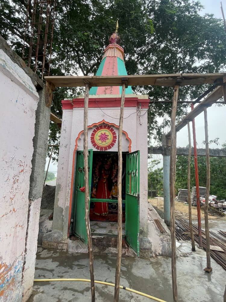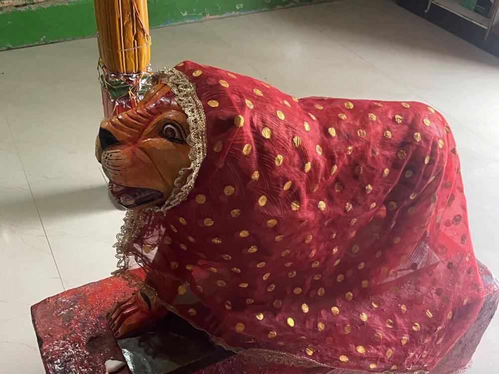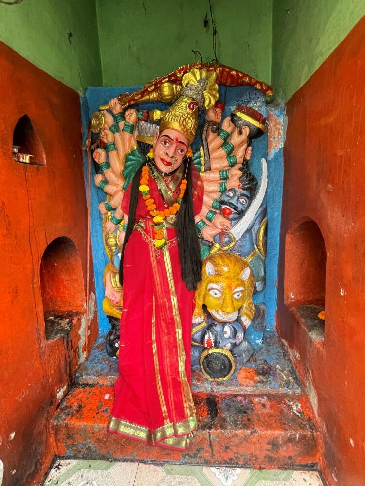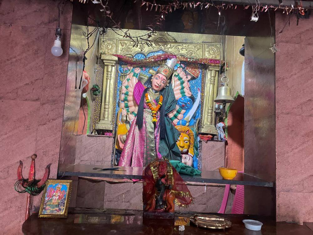 गर्भगृहात वज्रपिठावर असलेल्या सोनेरी नक्षीदार मखरात, चार फूट उंचीची, पाषाणात कोरलेली देवीची मूर्ती आहे. सिंहावर आरूढ असलेल्या या देवीचे रूप सौम्य भासते. देवीच्या १८ हातांमध्ये विविध आयुधे आहेत. त्यामुळे या देवीलाअष्टादश देवीअसेही म्हणतात. देवीचा डावा हात कानामागे आणि मान तिरकी आहे. डोक्यावर मुकुट, कानात कर्णफुले, नाकात नथ, गळ्यात मंगळसूत्र, पुतळ्यांचे गाठले, हातांत हिरव्या बांगड्या, कमरेला कमरपट्टा, पायात तोडे असे अलंकार आहेत. या मूर्तीच्या समोर देवीची छोटी शेंदूरचर्चित व्याघ्रारूढ पाषाणमूर्ती आहे. तर वज्रपिठाच्या समोरच्या बाजूला खाली देवळीत गणेशाची शेंदूरचर्चित मूर्ती विराजमान आहे