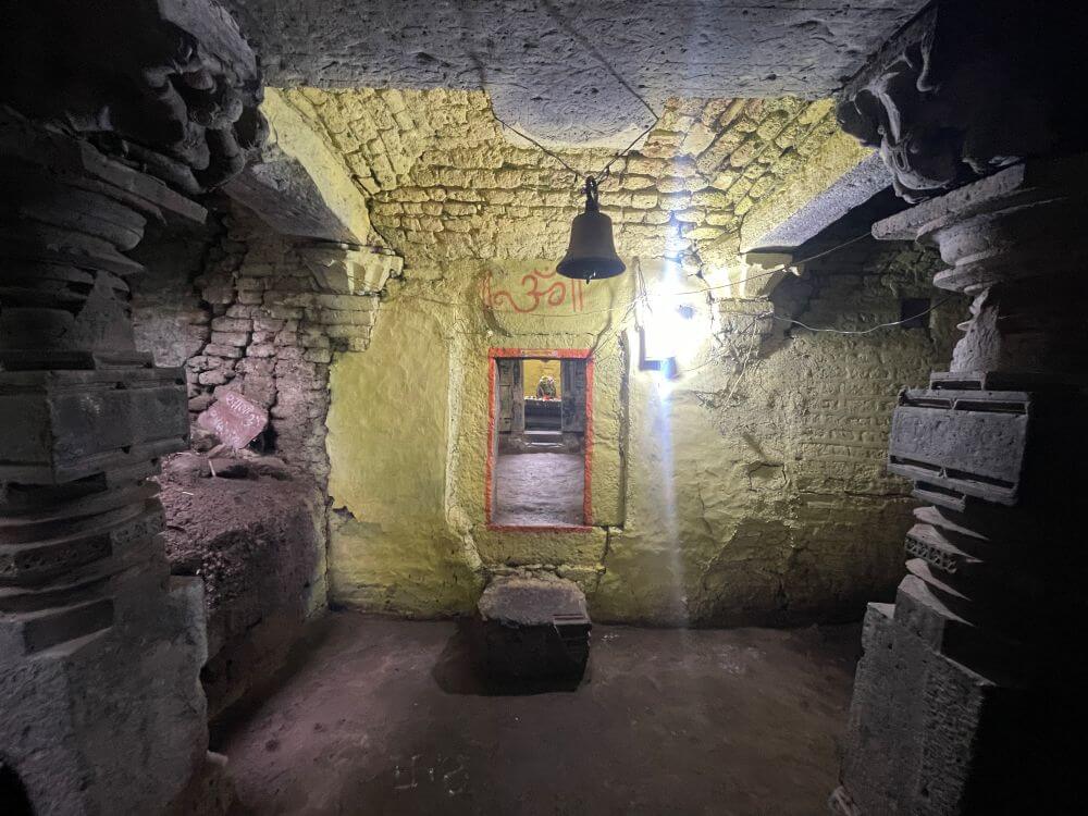 बंदिस्त स्वरूपाच्या सभामंडपात मध्यभागी चार नक्षीदार स्तंभ आहेत. स्तंभाचा खालील भाग चौकोनी व त्यावरील भागात षट्कोन, अष्टकोन, द्वादशकोन, वर्तुळ असे विविध भौमितिक आकार आहेत. स्तंभांवर विविध नक्षी कोरलेली आहे. स्तंभांच्या शीर्षभागी कणी व कणीवर हस्त आहेत. हस्तांवर चतुर्भुज यक्षशिल्पे आहेत. उत्तरेकडील दोन स्तंभांवरील यक्षांचे पुढील दोन हात गुडघ्यावर टेकलेले आहेत व त्यांनी मागील दोन हातांनी छताचा भार तोलून धरलेला आहे, असे भासते. दक्षिणेकडील स्तंभांवरील यक्ष छताचा भार तोलत असतानाच पशूयुद्ध करीत असल्याची शिल्पे कोरलेली आहेत. स्तंभ, कणी, हस्त व तुळईवर विविध नक्षीकाम आहे. अष्टकोनी वितानावर मध्यभागी झुंबर असलेली चक्राकार नक्षी आहे. सभामंडपाच्या भिंती प्राचीन भाजक्या विटा वापरून बांधण्यात आलेल्या आहेत. सभामंडपाचे एकंदर स्वरूप पाहता त्याची नंतरच्या काळात दुरुस्ती झाल्याचे जाणवते.