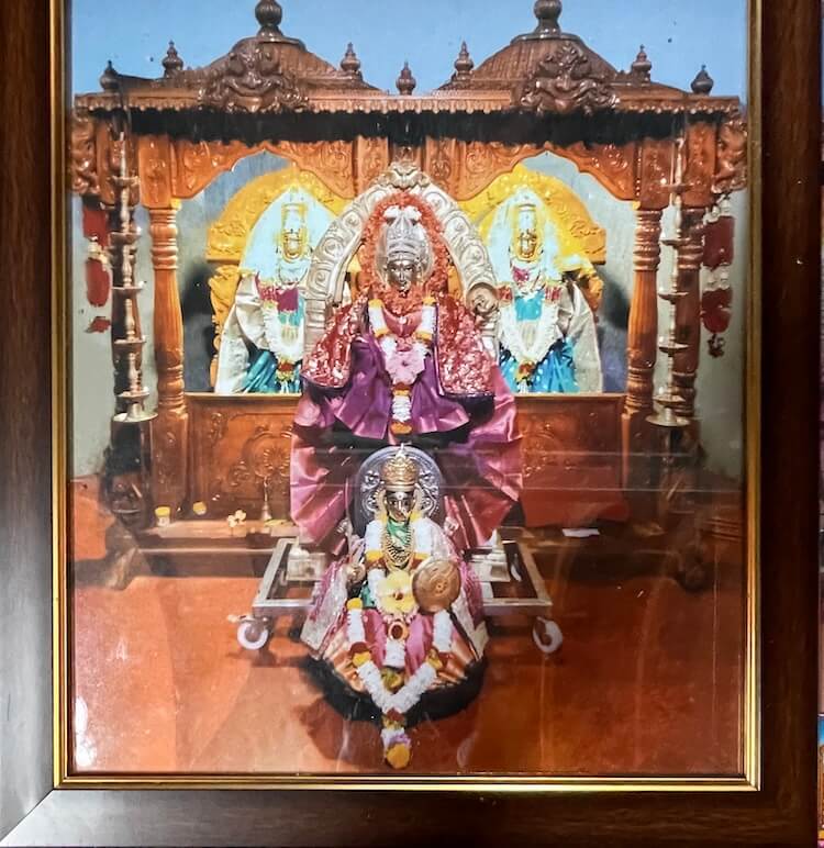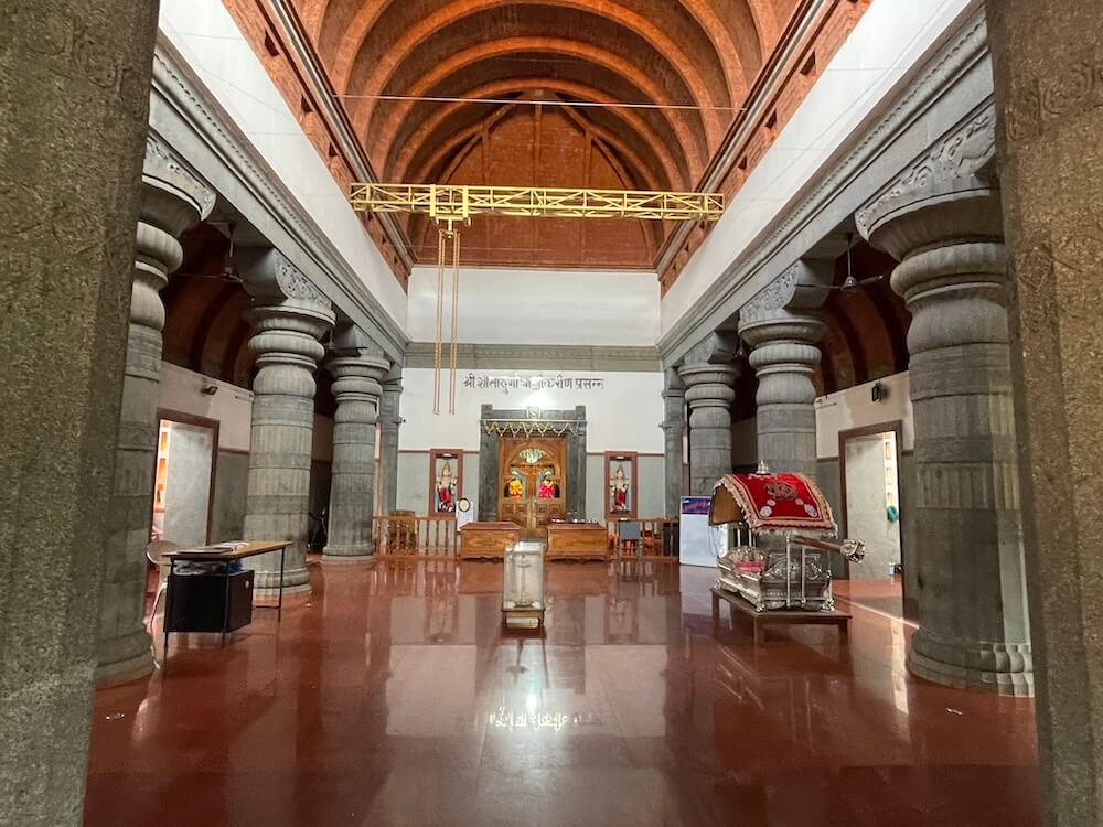 प्रांगणातून सहा पायऱ्या चढून उंच जगतीवर असलेल्या या मंदिराच्या अर्धखुल्या सभामंडपात प्रवेश होतो. अंतराळात अर्धगोलाकार छत आणि दगडी शैलीचे खांब दिसतात. अंतराळात पुढील बाजुला प्रदक्षिणामार्ग सोडून गर्भगृहाची रचना आहे. गर्भगृहाच्या द्वारशाखांवर पानाफुलांचे नक्षीकाम व खालील बाजुस द्वारपाल कोरलेले आहेत. याशिवाय गर्भगृहाच्या दर्शनी भिंतीतील देवकोष्टकांत दोन्ही बाजुला द्वारपालमूर्ती आहेत. प्रवेशद्वाराच्या ललाटबिंबस्थानी गणेशाची मूर्ती आहे. गर्भगृहातील वज्रपिठावर देवीच्या दोन मूर्ती आहेत. काळ्या शिळेत घडवलेल्या या दोन्ही मूर्ती स्वतंत्र लाकडी मखरात स्थापित आहेत.