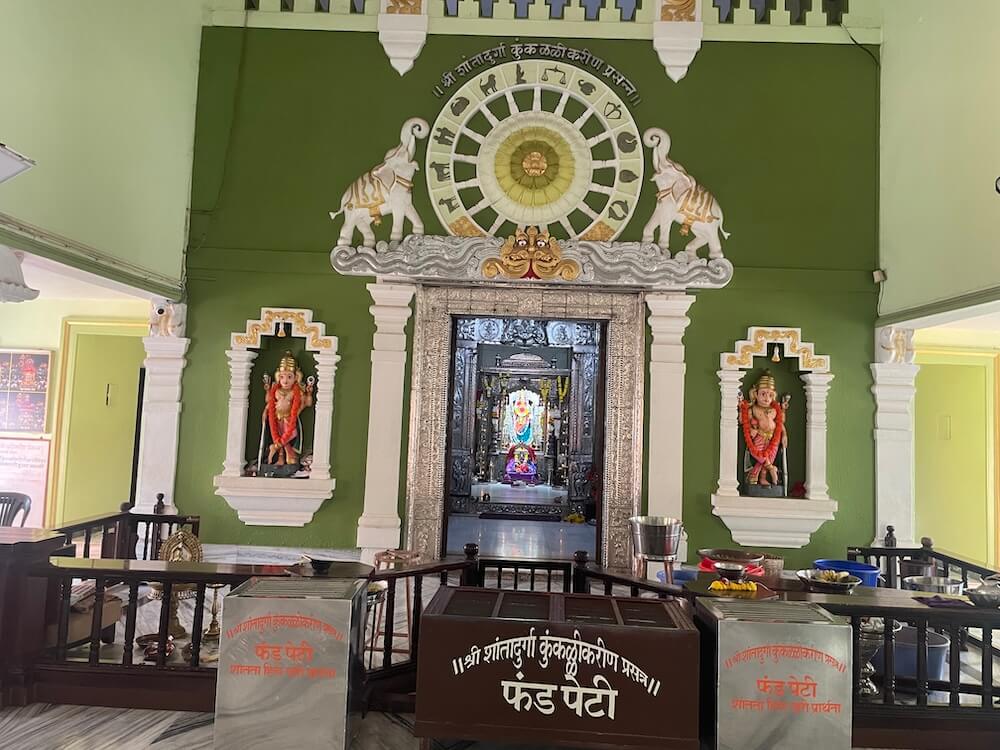 त्यांच्या बाजुला हत्तींची उठावशिल्पे आहेत. दरवाजाच्या चौकटीवर चांदीचा पत्रा जडविण्यात आला आहे. दरवाजाच्या दोन्ही बाजुला देवकोष्टकांत द्वारपाल आहेत. पुढे गर्भगृहाचा दरवाजाही चांदीच्या पत्र्याने मढवलेला आहे. गर्भगृहात चांदीची महिरप असलेल्या वज्रपिठावर देवीची मोठी मूर्ती आहे. देवीच्या डावीकडे खंडोबाची मूर्ती आहे. खंडेरायानेच देवीला कुंकळ्ळीला आणले, अशी भक्तांची श्रद्धा आहे. मंदिरावर चौकोनी आकारातील वर उंच जाणारे कौलारू शिखर व त्यावर कळस आहे.