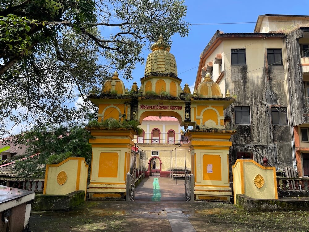 मुख्य रस्त्यापासून मंदिराकडे येणाऱ्या रस्त्यावर मंदिराची मोठी स्वागतकमान आहे. कमानीत रस्त्याच्या दोन्ही बाजूला दोन चौकोनी स्तंभ असून स्तंभांवर सज्जा आहे. सज्जावर अर्धचंद्राकार बाशिंग व त्यावर मध्यभागी एक व दोन्ही कडे दोन अशी एकूण तीन शिखरे आहेत. मंदिरासमोर प्रशस्त वाहनतळ आहे. मंदिराभोवती असणाऱ्या भक्कम तटबंदीत मागील व पुढील बाजुला असलेल्या प्रवेशद्वारांतून मंदिराच्या प्रांगणात प्रवेश होतो. मुख्य प्रवेशद्वार दुमजली आहे व त्याच्या वरील मजल्यावर नगारखाना आहे. प्रवेशद्वारास नक्षीदार लाकडी झडपा आणि आतील बाजूला लाकडी छत आहे.