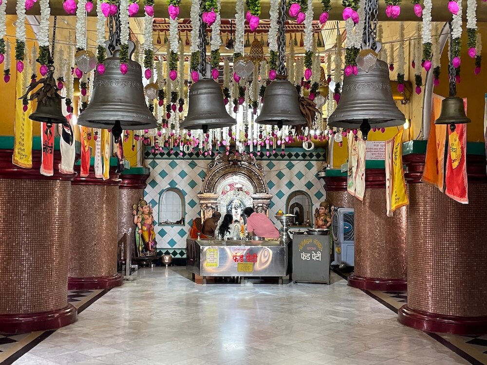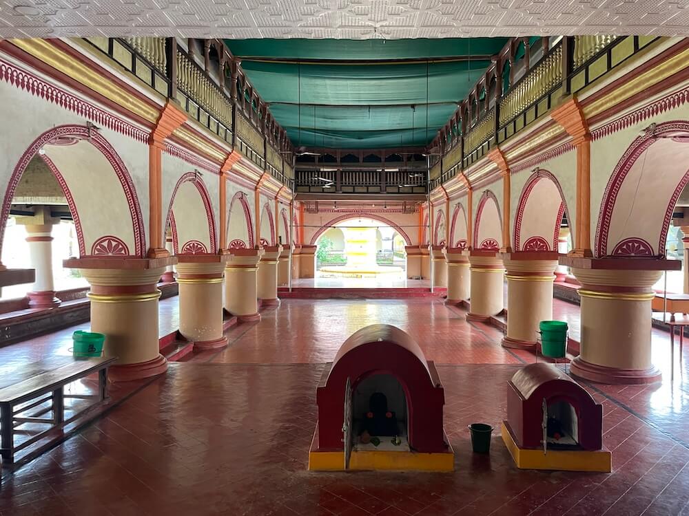 पुढे मुख्य सभामंडपाचे प्रवेशद्वार सभामंडपापेक्षा उंचावर असल्यामुळे प्रवेशद्वारास पायऱ्या आहेत. प्रवेशद्वारास नक्षीदार लाकडी झडपा आहेत. मुख्य सभामंडप दुमजली आहे. मुख्य सभामंडपात प्रत्येकी सहा गोलाकार स्तंभांच्या चार रांगा आहेत. प्रत्येक रांगेतील स्तंभ एकमेकांना अर्धचंद्राकार कमानीने जोडलेले आहेत व कमानीवर वरील मजल्याचा सज्जा आहे. पुढे गर्भगृहाचे प्रवेशद्वार आहे. गर्भगृहाच्या स्तंभशाखा व त्यावरील तोरण चांदीचे आहे. तोरणात मध्यभागी कीर्तीमुख आहे. गर्भगृहात वज्रपिठावर शांतादुर्गा देवीची काळ्या पाषाणातील मूर्ती आहे. ही मूर्ती अलीकडील काळात घडवली असल्याचे सांगितले जाते.