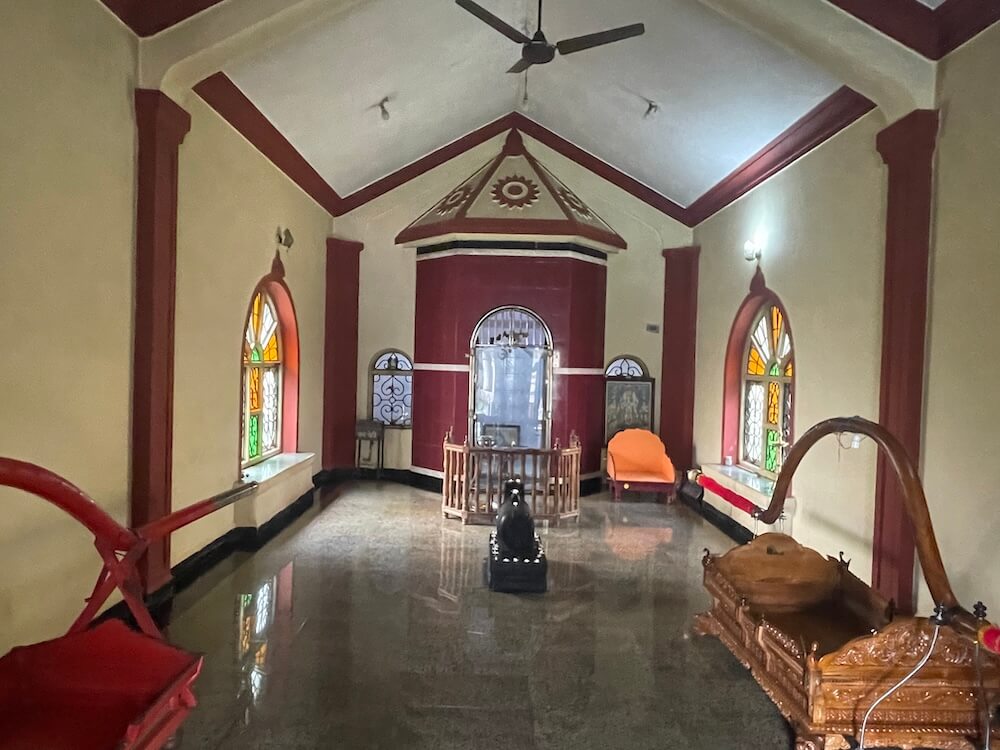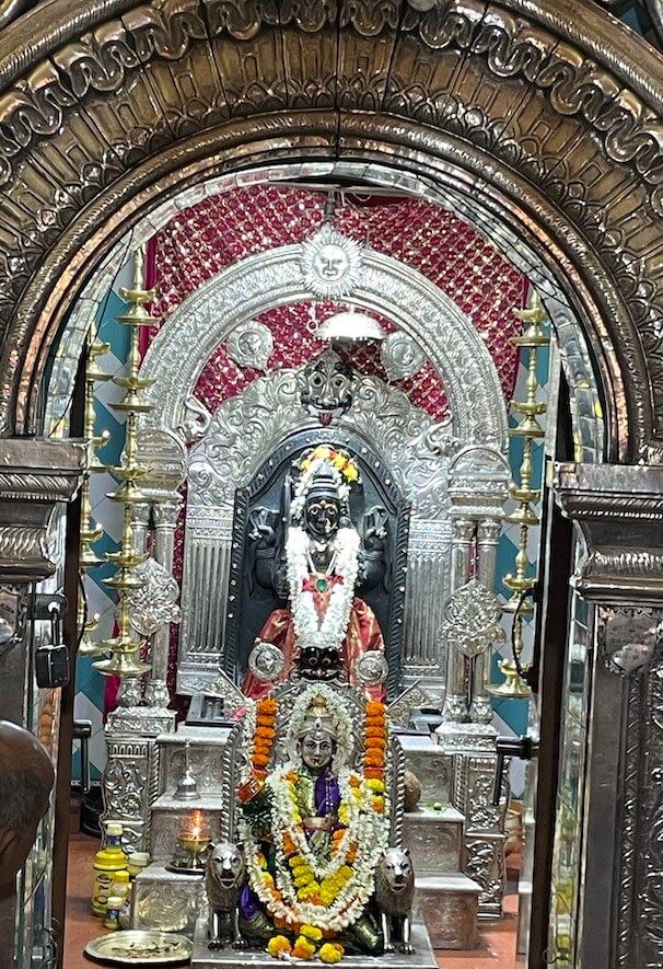 मूर्तीच्या मागील चांदीच्या प्रभावळीत मध्यभागी कीर्तीमुख व दोन्ही बाजूला पानाफुलांच्या नक्षी आहेत. मूर्ती चांदीच्या मखरात विराजमान आहे व मखरातील स्तंभांवर गजतोरण आहे. वज्रपिठापुढे चांदीच्या सिंहासनावर विराजमान देवीची चांदीची उत्सवमूर्ती आहे. ही मूर्ती पालखी सोहळ्यावेळी पालखीत ठेवण्यात येते. शांतादुर्गा देवीच्या उजव्या बाजूला वज्रपिठावर सातेरी देवीची काळ्या पाषाणातील मूर्ती आहे. या देवीचे मूळ स्थान म्हापसा येथे असल्याचे सांगितले जाते. देवीच्या मागील बाजूला इतर स्थानिक देवतांची पाषाणे आहेत. गर्भगृहाच्या छतावर दोन थरांचे शिखर आहे. त्याचा खालील पहिला थर चौकोनी आहे. दुसरा गोलाकार थर उंच व वर निमुळता आहे. शिखराच्या शीर्षभागी अमलक, कळस व ध्वजपताका आहे.