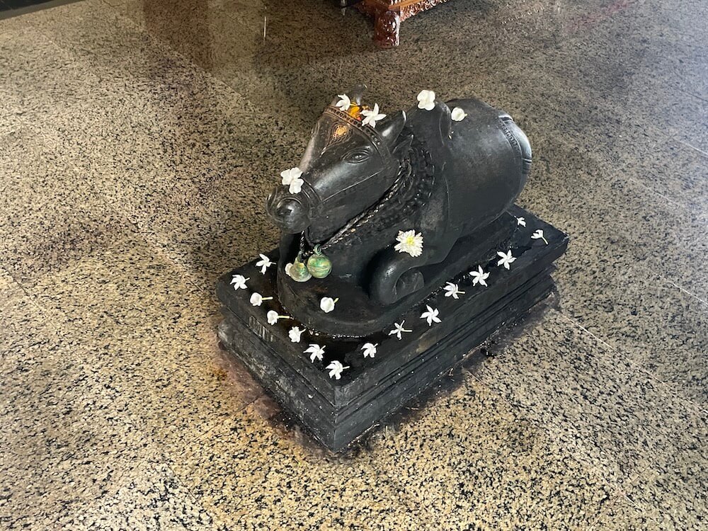 मंदिराच्या मागील प्रवेशद्वाराच्या दोन्ही बाजूला दोन भक्कम स्तंभ आणि त्यांवर सज्जा आहे. सज्जावर मध्यभागी गोपुरम् पद्धतीचे उंच शिखर व दोन्ही बाजूला दोन लहान शिखरे आहेत.