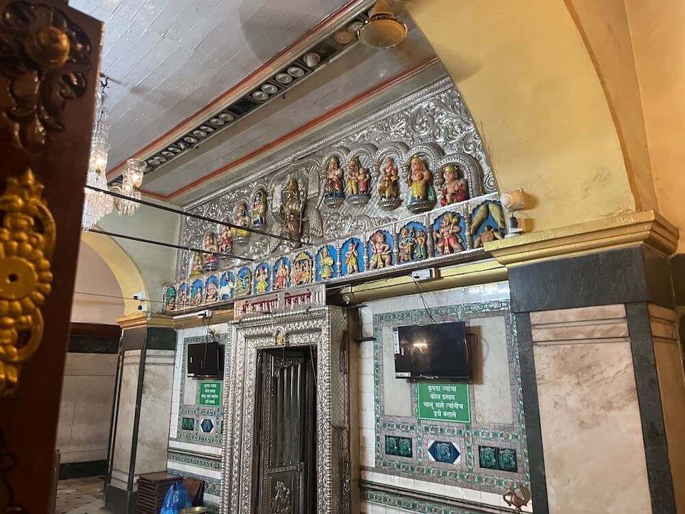 त्यामागे चांदीच्या मखरात देवीची पंचधातूची अभयमुद्रेतील पारंपारिक रेशमी वस्त्रे व मंगळसूत्रादी अलंकारांनी शृंगारलेली मूर्ती विराजमान आहे. देवीच्या अलंकारांमध्ये मंगळसूत्र, गलश्री, मोहनमाळ, बांगड्या, पैंजण यांचा समावेश आहे. देवीच्या मस्तकी सोन्याचा मुकूट आहे. देवीच्या आसनाच्या बाजूला दोन सेविकांच्या मूर्ती आहेत. मागील प्रभावळही नक्षीकामाने सुशोभित आहे. या शिवाय गर्भगृहात देवीच्या उत्सवमूर्तीही ठेवलेल्या आहेत. गर्भगृहावर अष्टकोनी मनोरा, त्यावर घुमट, त्यावर छोट्या मेघडंबरीसारखी रचना आणि त्यावर कलश अशा रचनेचे उंच व भव्य असे शिखर आहे.