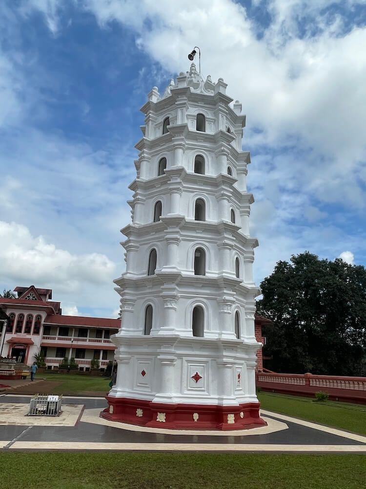 शांतादुर्गा देवीच्या पूजेचे साहित्य विकणाऱ्या अनेक दुकानांच्या रांगेतून पुढे आल्यानंतर, एका तलाव लागतो. त्याच्या काठावरून असलेल्या छोट्या मार्गिकेवर असलेल्या नौबतखान्याच्या द्वारातून मंदिराच्या प्रशस्त आवारात प्रवेश होतो. आत डावीकडच्या बाजूस पांढऱ्या शुभ्र रंगात रंगवलेला सात स्तरांचा उंच अष्टकोनी दीपस्तंभ आहे. त्यालगत क्षेत्रपालाचा पाषाण आहे. समोर खास गोमंतकीय स्थापत्यशैलीतील मंदिराची भव्य वास्तू उभी आहे.