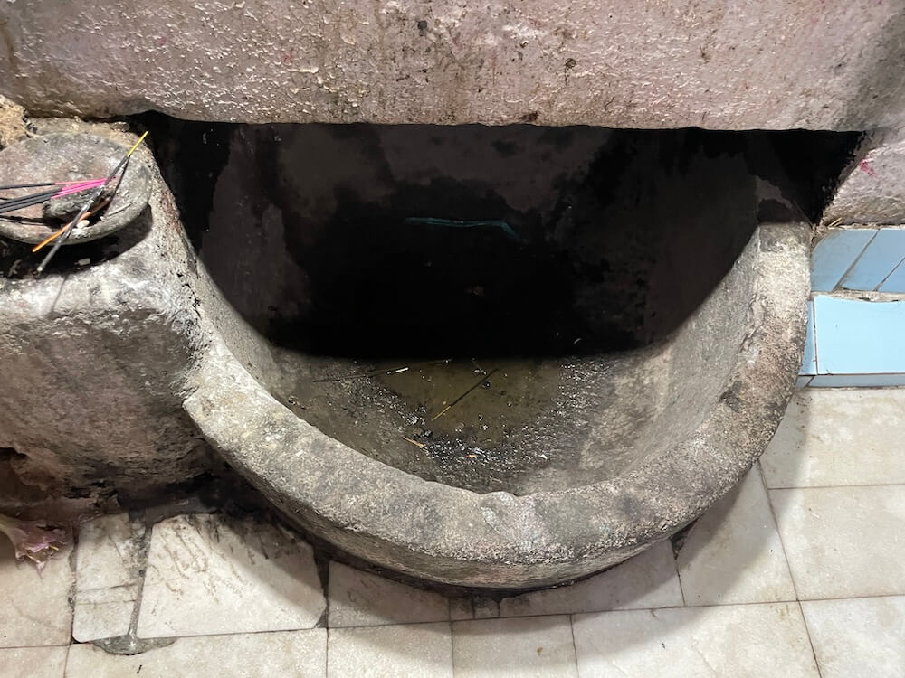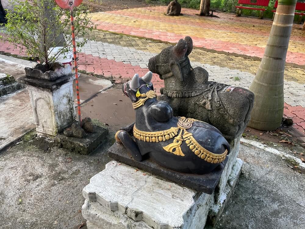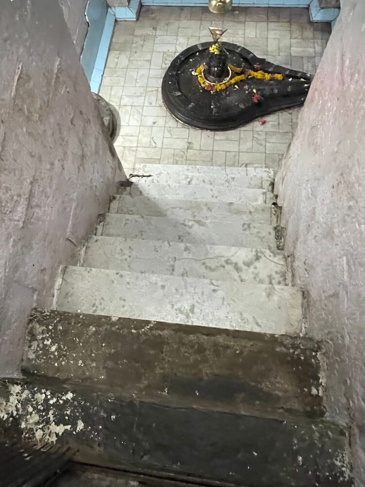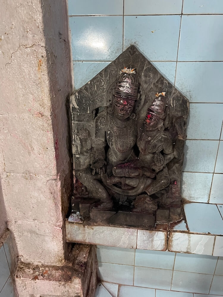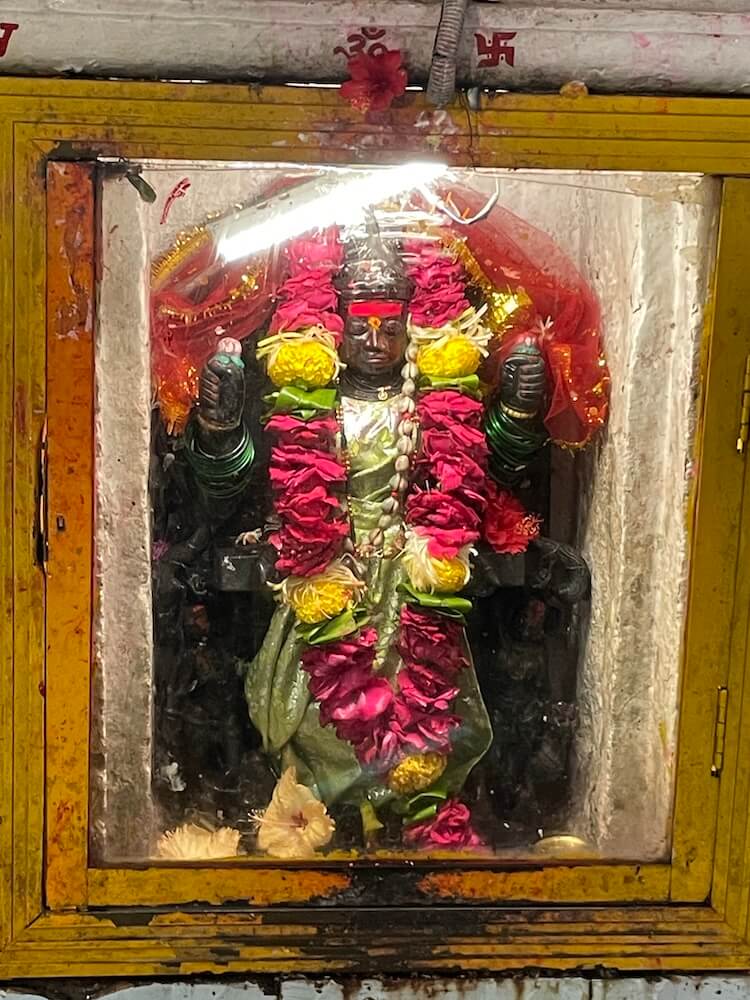 येथील गर्भगृह जमिनीपासून खोल व चौकोनाकार आहे. नऊ पायऱ्या उतरून गर्भगृहात प्रवेश होतो. येथे मध्यभागी शिवपिंडी आहे. या शिवपिंडीची शाळुंका मोठ्या आकाराची आहे. तिच्या मध्यभागी पंचमुखी लिंग आहे. त्यावर पितळेच्या नागफण्याचे छत्र आहे. त्यावर अभिषेकपात्र आहे. मागील भिंतीवरील देवकोष्ठकात काळ्या पाषाणातील देवीची चतुर्भुज मूर्ती विराजमान आहे. विविध अलंकार परिधान केलेल्या या मूर्तीच्या मस्तकी शिवलिंग कोरलेला मुकुट आहे. तिच्या पायांजवळ दोन्ही बाजूला दोन सेविकांच्या मूर्ती कोरलेल्या आहेत. त्यांच्या हातात शस्त्रे आहेत. ही शक्तिदेवता म्हणून ओळखली जाते. याशिवाय गर्भगृहात शंकर-पार्वतीची एक प्राचीन मूर्ती आहे. यात पार्वती ही महादेवाच्या वामांगावर आरूढ आहे. त्यात शंकराच्या पायांजवळ डाव्या बाजूला गणेश, तर उजव्या बाजूला कार्तिकेय आहे. याचप्रमाणे येथे देवीची एक प्राचीन मूर्तीही विराजमान आहे.