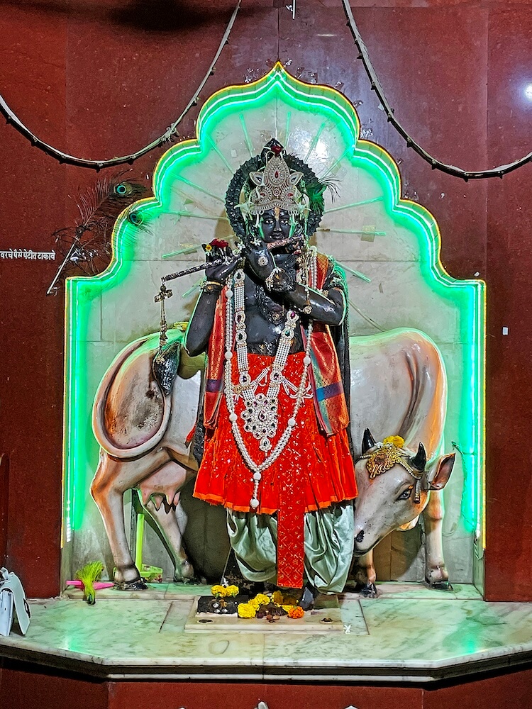 अकोट शहराच्या मध्यवर्ती ठिकाणी हे मंदिर आहे. मंदिराभोवती असलेल्या आवारभिंतीत दोन प्रवेशद्वारे आहेत. यातील मुख्य प्रवेशद्वार दुमजली आहे. या प्रवेशद्वाराच्या दोन्ही बाजूला कक्षासने आहेत. या प्रवेशद्वारातून मंदिराच्या प्रागंणात प्रवेश होतो. पेव्हरब्लॉकची फरसबंदी असलेल्या या प्रांगणात भाविकांना बसण्यासाठी आसने आहेत. सभामंडप, अंतराळ व गर्भगृह अशी या मंदिराची संरचना आहे. कमानीकृती प्रवेशद्वारातून अर्धखुल्या सभामंडपात प्रवेश होतो. या सभामंडपात सर्वत्र संगमरवरी फरसबंदी आहे. येथून पुढे अंतराळाचे प्रवेशद्वार आहे. अंतराळाच्या लाकडी प्रवेशद्वाराच्या द्वारशाखेवर नक्षीकाम आहे. अंतराळाप्रमाणेच गर्भगृहाच्या प्रवेशद्वारावर मंगलकलश व पर्णवेलींचे नक्षीकाम आहे. गर्भगृहात उंच संगमरवरी वज्रपिठावर बासरीवादन करणाऱ्या श्रीकृष्णाची मूर्ती आहे. मूर्तीच्या डोक्यावर सुंदर मुकूट व मागील बाजूला गाय आहे. याशिवाय गर्भगृहात कृष्णमूर्तीच्या दोन्ही बाजूला विशेष पाषाण आहेत.