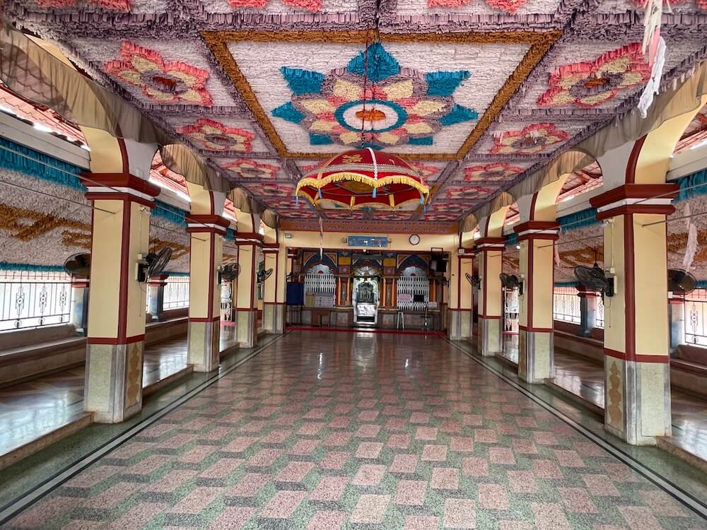 अर्धखुल्या प्रकारच्या या सभामंडपास दोन्ही बाजूंनी कक्षासने आहेत व त्याच्या वरच्या भागात खिडक्या आहेत. येथून आत दोन्ही बाजूंस काही अंतर सोडून स्तंभरांगा आहेत. सभामंडपाच्या छतावर आतील बाजूंनी कागदी झिरमिळ्यांनी केलेली प्रेक्षणीय रांगोळी आहे. येथेच मध्यभागी एक मोठे लाल रंगातील छत्र टांगलेले आहे.