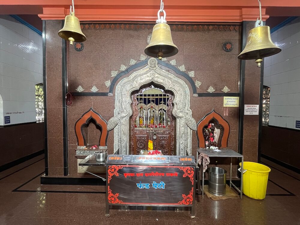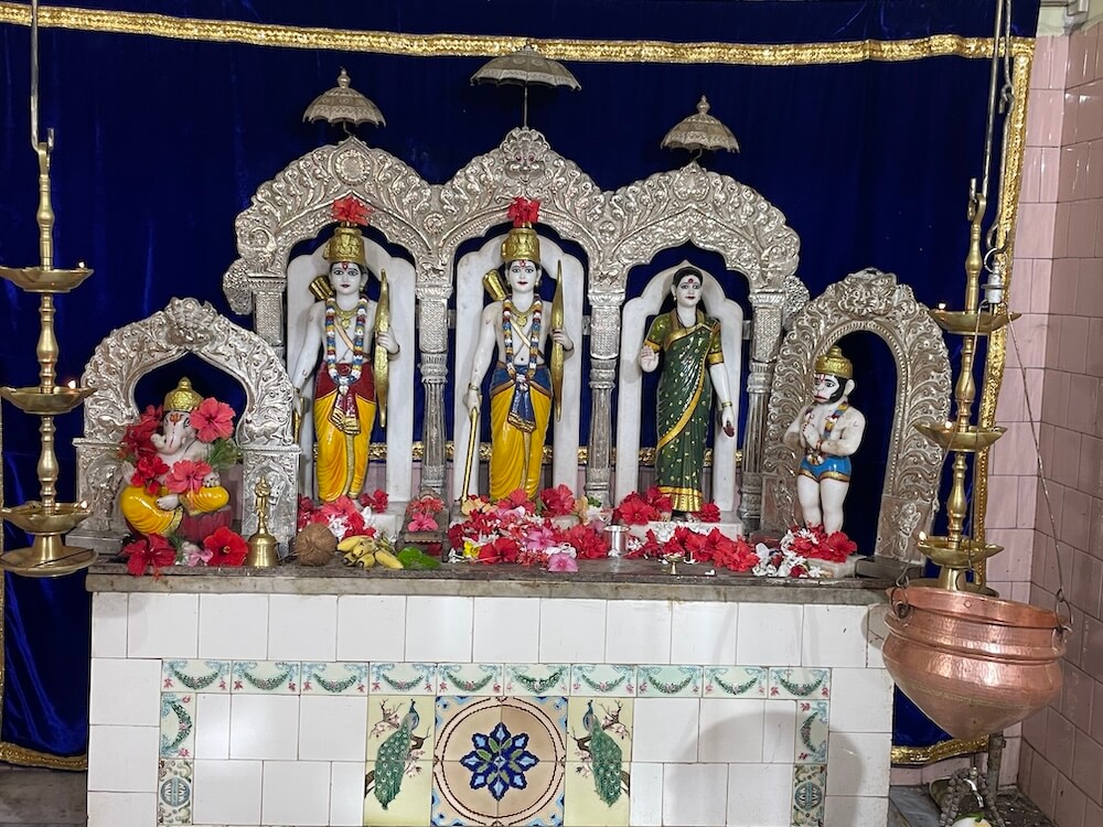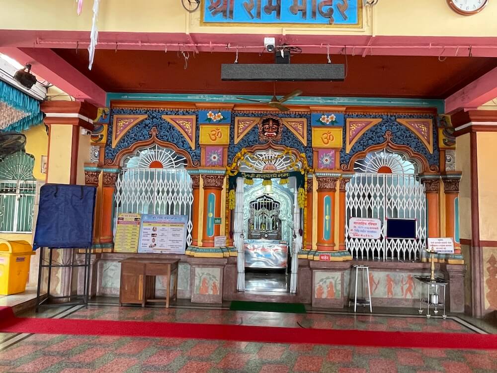 समोरच मंदिराचा अर्धमंडप आहे. त्याच्या दर्शनी भिंतीतील प्रवेशद्वाराच्या दोन्ही बाजूंस दोन मोठ्या महिरपी कमानदार खिडक्या आहेत. त्यांच्या खालच्या बाजूस रामायणातील काही प्रसंग चितारलेले आहे. प्रवेशद्वाराच्या वरच्या बाजूस कीर्तिमुख आहे. अर्धमंडपात बाजूने प्रदक्षिणा मार्ग सोडून मध्यभागी मंदिराचे गर्भगृह आहे. संगमरवरी फरशांनी सुशोभित केलेल्या या गर्भगृहाच्या प्रवेशद्वारास कोरीव नक्षीकाम केलेला चंदेरी पत्रा मढवलेला आहे. त्याच्या द्वारस्तंभांवर मध्यभागी सुंदर मयुराकृती कोरलेल्या आहेत, तर ललाटबिंबस्थानी गणेशाची कोरीव मूर्ती विराजमान आहे. प्रवेशद्वाराच्या दोन्ही बाजूंस दोन देवळ्या आहेत. त्यातील उजवीकडील देवळीत हनुमानाची पाषाणमूर्ती आहे. या मूर्तीस भाविक तेल वाहतात. आत संगमरवरी चौथऱ्यावर चांदीच्या मखरांमध्ये प्रभू श्रीरामचंद्र, लक्ष्मण आणि सीता यांच्या मूर्ती आहेत. संगमरवरी पाषाणात घडवलेल्या या मूर्तींना वस्त्रे-प्रावरणे आहेत. येथील सीतामातेच्या मूर्तीचे वैशिष्ट्य म्हणजे तिने आधुनिक पद्धतीची साडी परिधान केलेली आहे. या मूर्तींच्या डावीकडील मखरात गणेशाची, तर उजवीकडील मखरामध्ये हनुमानाची नमस्कार मुद्रेतील मूर्ती विराजमान आहे.