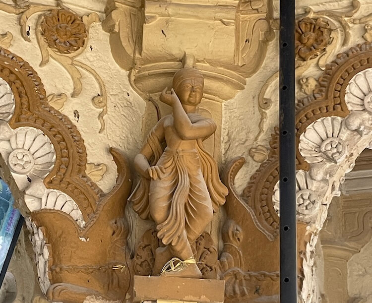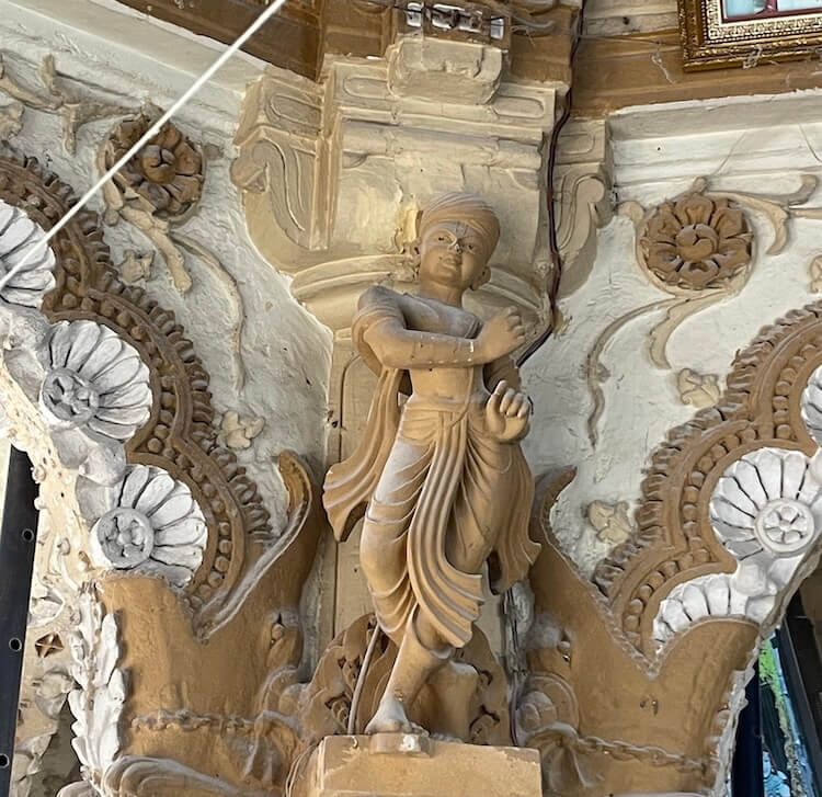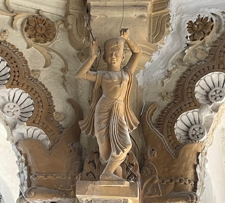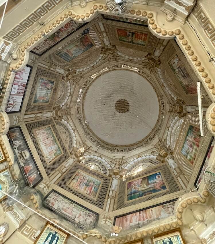Sculptures of various deities, Yakshas (celestial spirits), Gandharvas (celestial musicians) and Sursundaris (celestial beauties) are carved upon the pillars and the arches above them, as well as the walls of the temple. Neither iron nor steel has been used anywhere in the construction. Along with the interior of the temple, the exterior walls are also adorned with sculptural beauty. One enters the Sabhamandap (assembly hall) through the Mukhamandap (entrance porch). The ceiling of this Sabhamandap is dome-shaped and features carvings of dancers and mythological scenes. Paintings underlining the greatness of the Swaminarayan Sampradaya and depicting various episodes from the life of the Swami are displayed on the walls of the Sabhamandap.