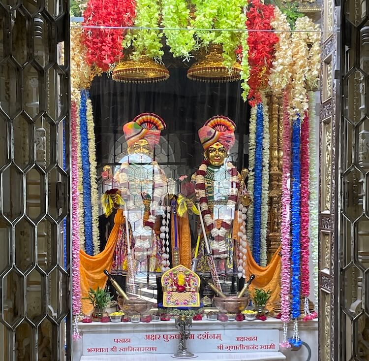 There are three Garbhagrihas (sanctum sanctorums) in this temple. In the main Garbhagriha located in the centre, Akshar-Purushottam Maharaj has been consecrated. Within this, the idols of Bhagwan Swaminarayan and his greatest devotee Gunatitanand Swami are seated.