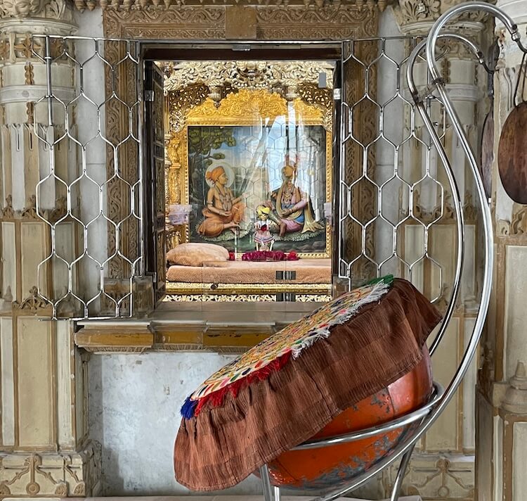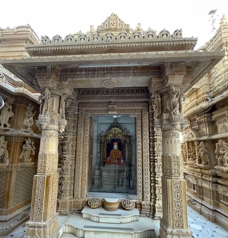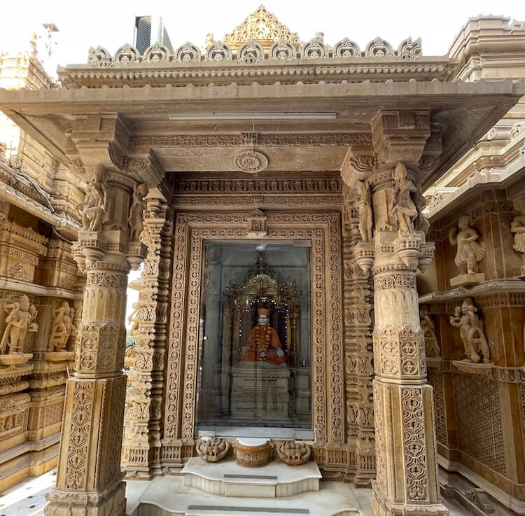 Besides these main idols, there are many other important shrines within the temple premises. Amongst these, the idol of Nilkanth Varni (Bhagwan Swaminarayan in his teenage ascetic form) is distinctive. On the ground floor of the temple is the ‘Akshar Bhuvan’. The idols of the founders of the Sampradaya, Shastriji Maharaj and Yogiji Maharaj, are seated there. In this very place, the sacred objects used by Bhagwan Swaminarayan and the saints of the Guru lineage, known as ‘Prasadi’, have been preserved with great care. There are also idols of Hanuman and Ganpati near the temple entrance and there is an old and small temple of Hanuman outside the temple premises.