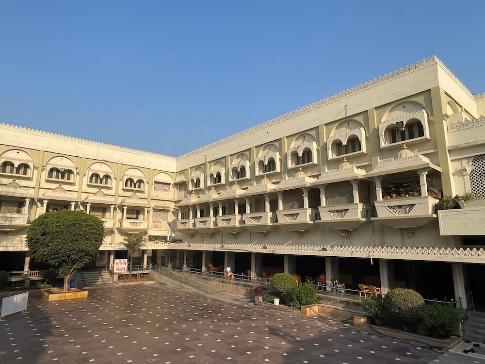 The temple is surrounded by a fortification of Bhakta Niwas (pilgrim rest house) buildings and there are massive gateways to enter the temple courtyard through these very buildings. Excellent arrangements for the stay of hundreds of devotees are available in the Bhaktaniwas here. An Annakshetra (charitable kitchen) is functional within the temple premises. Food is donated here daily. The wooden shutters of the gateway in the fortification are clad with metal sheets. Similar to the temple, the Bhaktaniwas and the Yugpurush Hall here are also rich in sculpture. There is unique carving on the walls, doorways and Gavaksha (oriel windows) of the buildings.